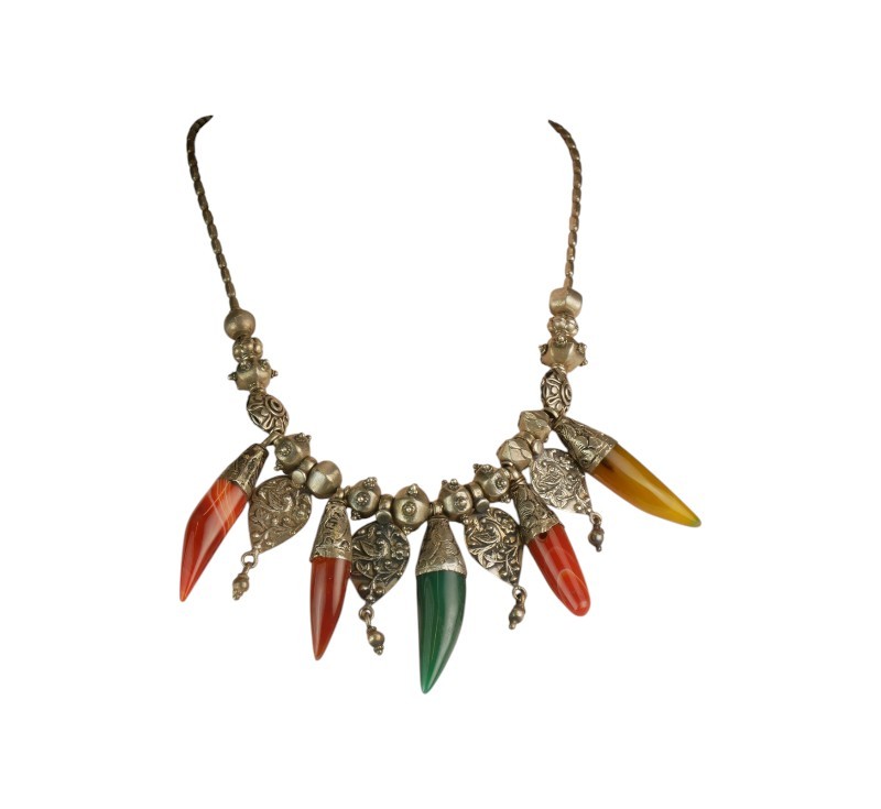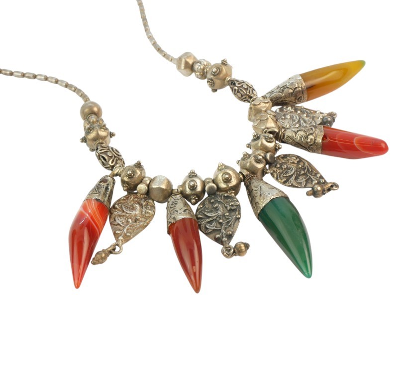Velmi zajímavý šperky - výrazný náhrdelník ze stříbra ryzosti 925/1000 s pěti ověsy zdobenými achátem, chrysoprasem a jaspisy. Celková hmotnost náhrdelníku 78,03 g, délka 47 cm.