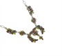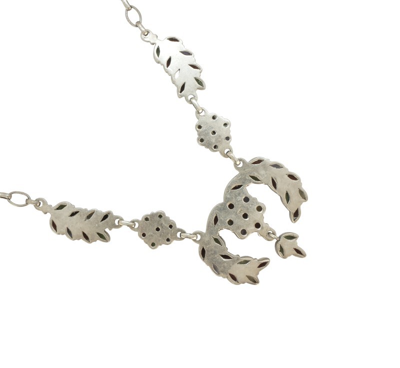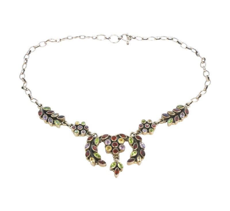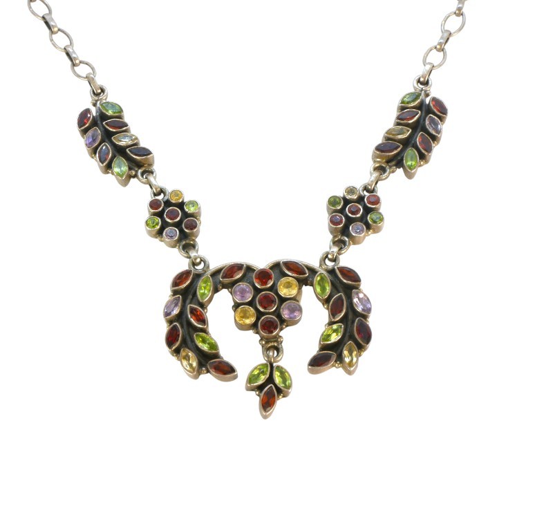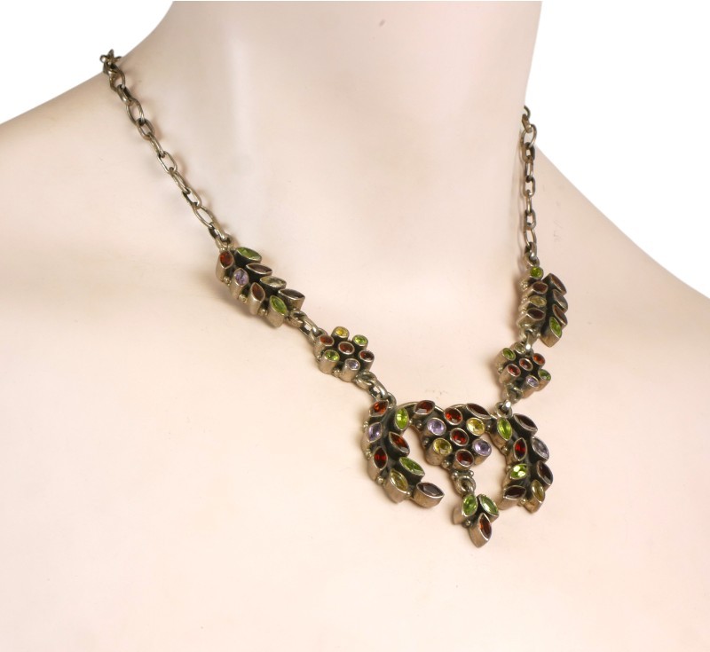 Náhrdelník vyrobený ze stříbra ryzosti 925/1000 (punc kozlík) zdobený barevnými polodrahokamy. Délka 43 cm. Celková hmotnost 44,42 g.