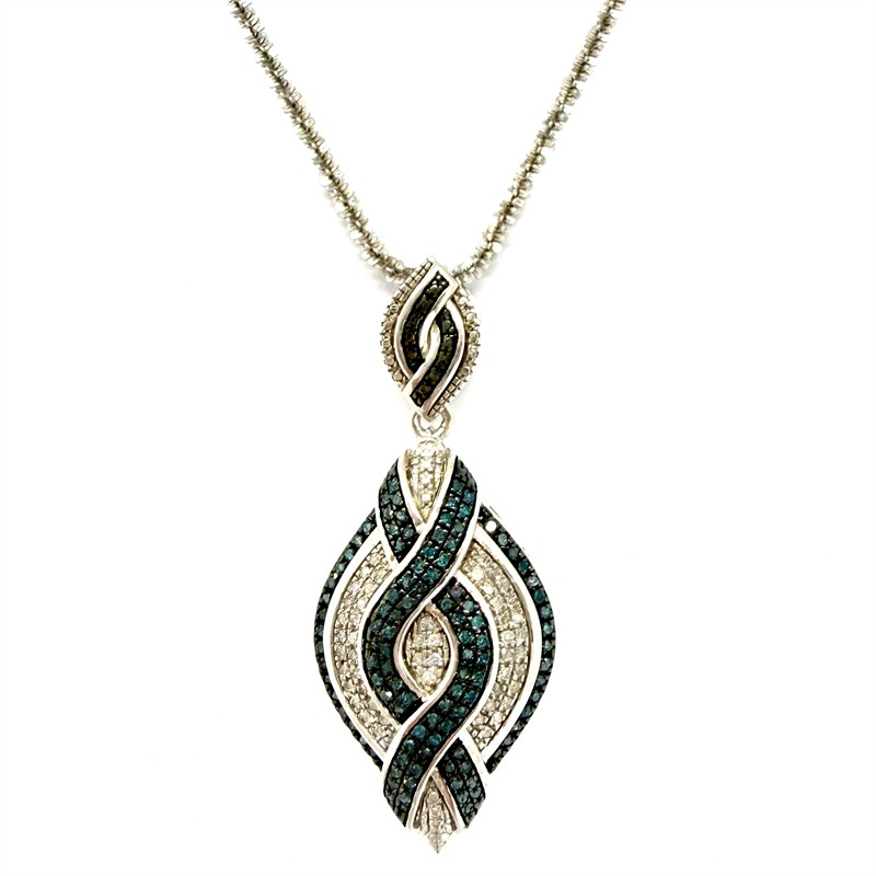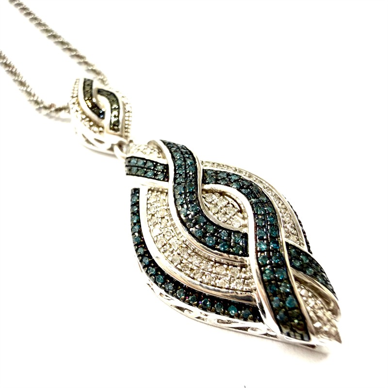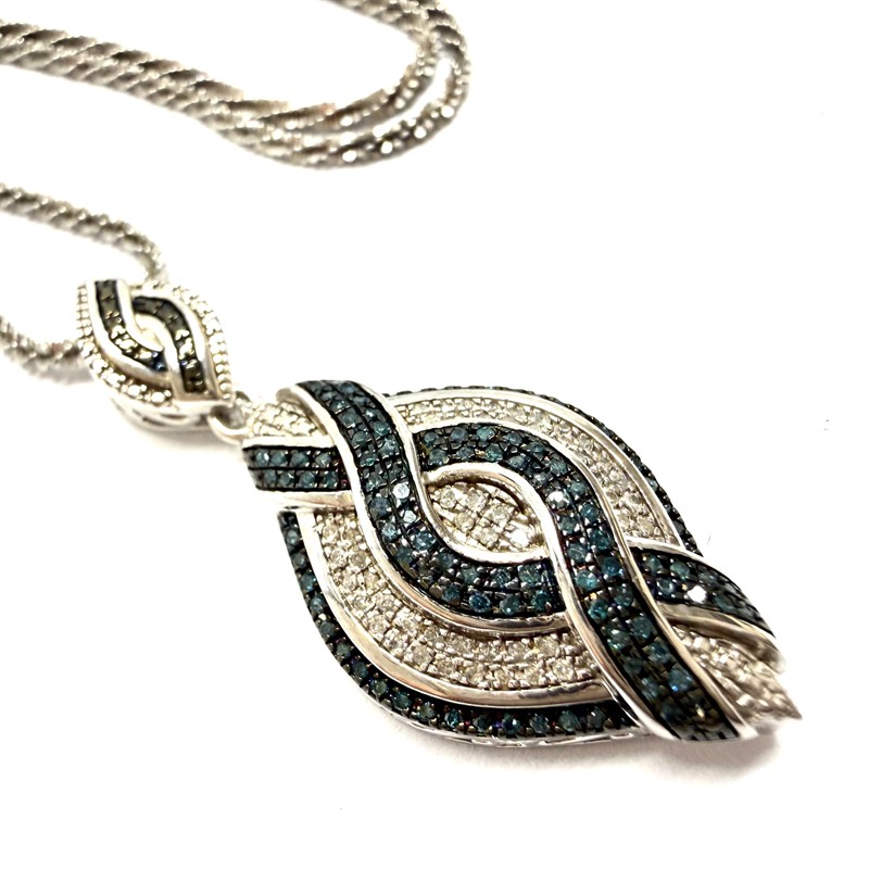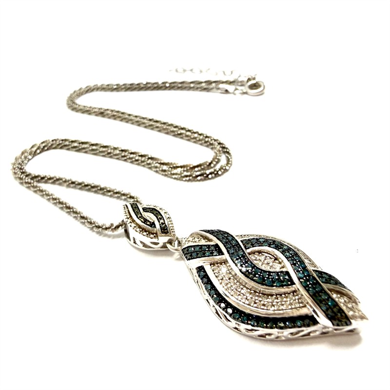 Elegantní, stříbrný šperk. Nevšedně splétaný řetízek zdobí větší, odnímatelný závěs. Ten byl inspirován ikonickým stylem Art deco. Šperk zdobí desítky drobných briliantů bílé a šedomodré barvy. Šperk byl vyroben ze sterlingového stříbra o celkové váze 9,55 g. Délka řetízku 43,5 cm + 5 cm prodlužovací část , rozměry závěsu cca 4 x 1,7 cm. Perfektní stav.