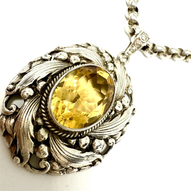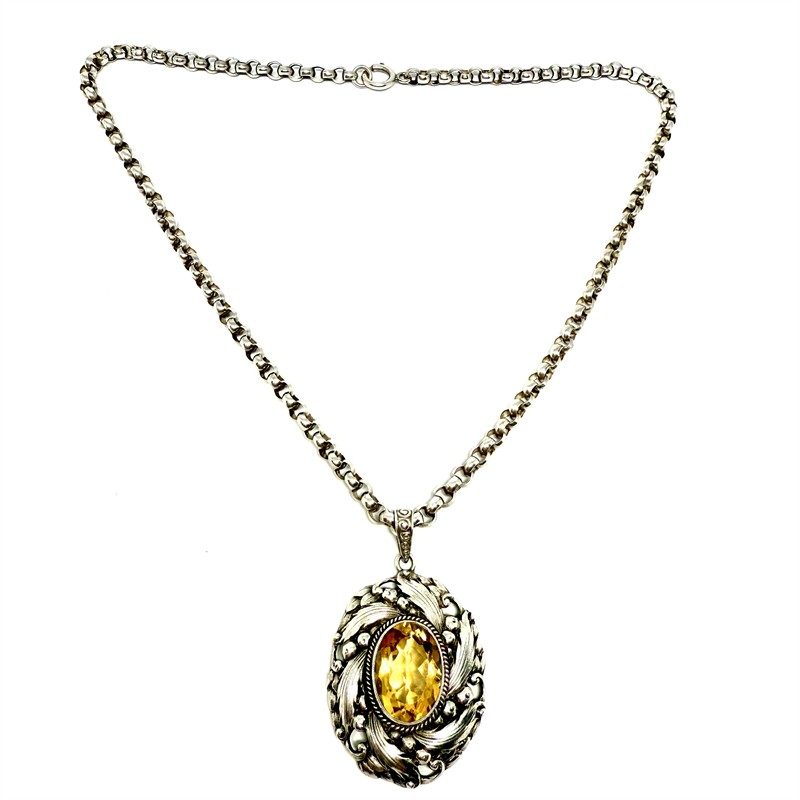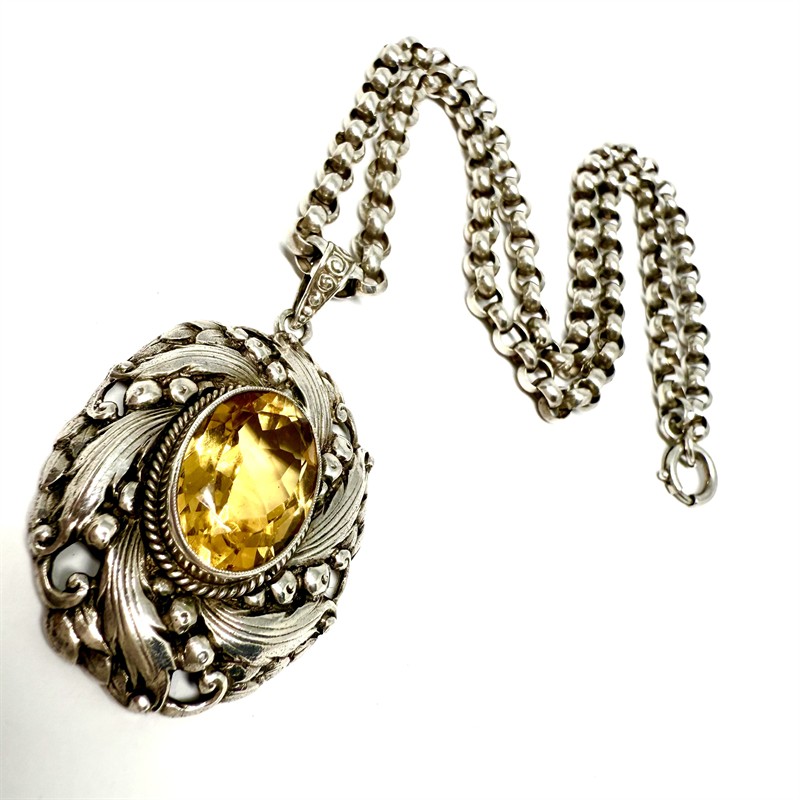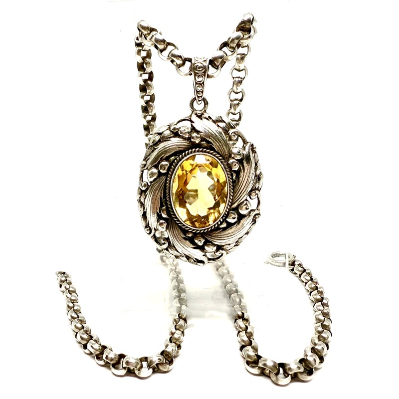 Nepřehlédnutelný, výrazný stříbrný náhrdelník -masivní řetízek s velkými oky a odnímatelným závěsem. Šperk zdobí v centrální části sytě žlutý, fazetově broušený citrín. Šperk byl zhotoven ze stříbra ryzosti 900/1000 na počátku 20.století. Celková váha 22,70 g. Délka řetízku 45 cm, rozměry závěsu cca 5 x 3 cm. Perfektní stav.