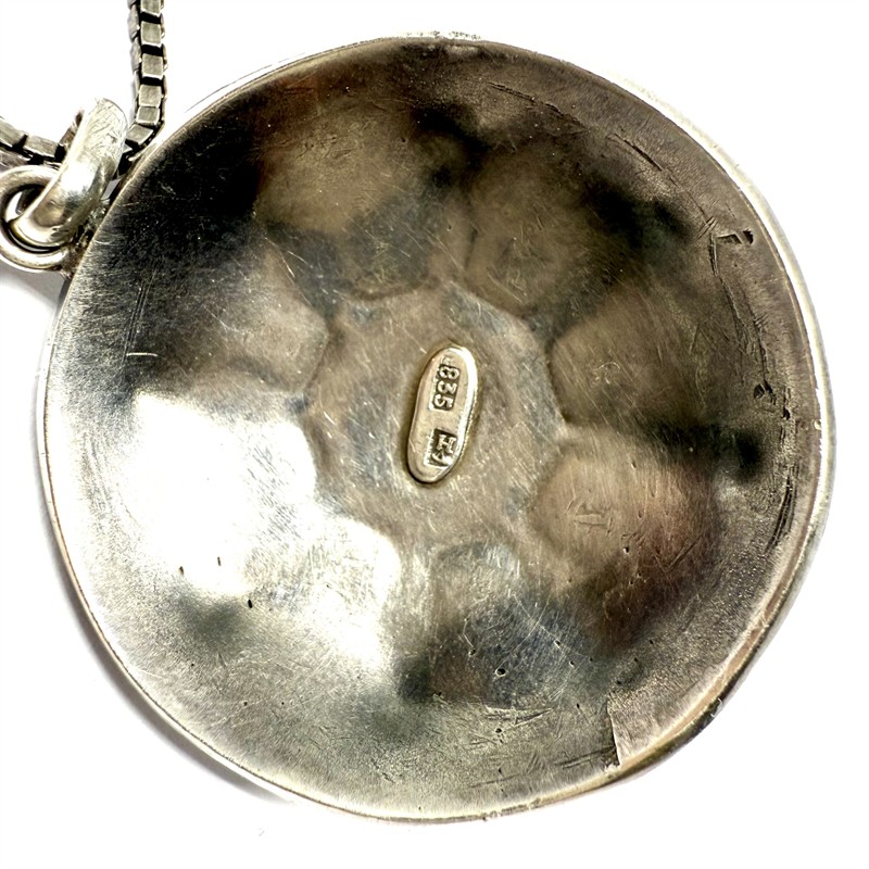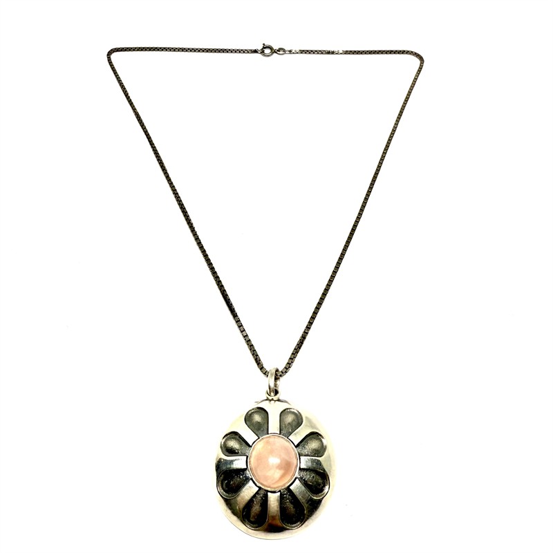 Originální náhrdelník - řetízek typu kostka, který zdobí odnímatelný závěs. Ten je na středu odsazen růženínem hladkého, kulatého brusu typu kabošon. Ten je zasazen do středu plastického květu. Šperk je nadčasový a byl zhotoven ze stříbra ryzosti 835/1000. Řetízek o délce 45 cm ze stříbra ryzosti 925/1000 . Celková váha šperku 18,72 g. Šperk je označen ryzostní, autorskou a puncovní značkou. Perfektní stav.