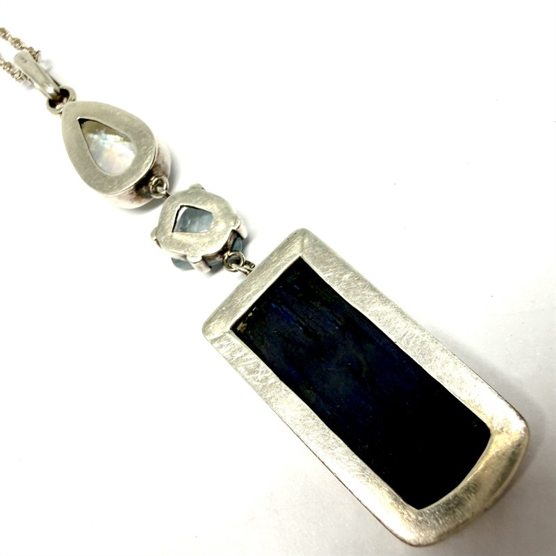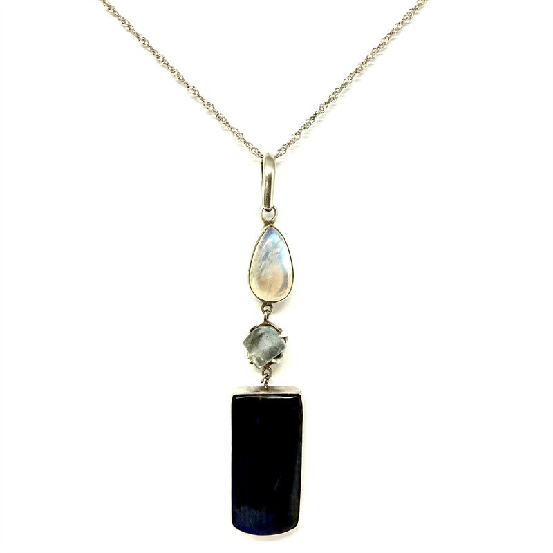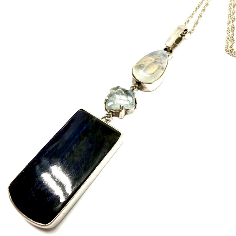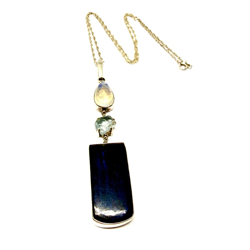 Dlouhý stříbrný náhrdelník s velkým závěsem s drahými kameny. Šperk zdobí velký, odnímatelný závěs zdobený temně modrým labradoritem, malým akvamarínem a měsíčním kamen hladkého brusu. Šperk byl vyroben ze sterligového stříbra (925/1000) o celkové váze 19,22 g. Délka závěsu 9 cm, délka řetízku 56 cm. Výborný stav.