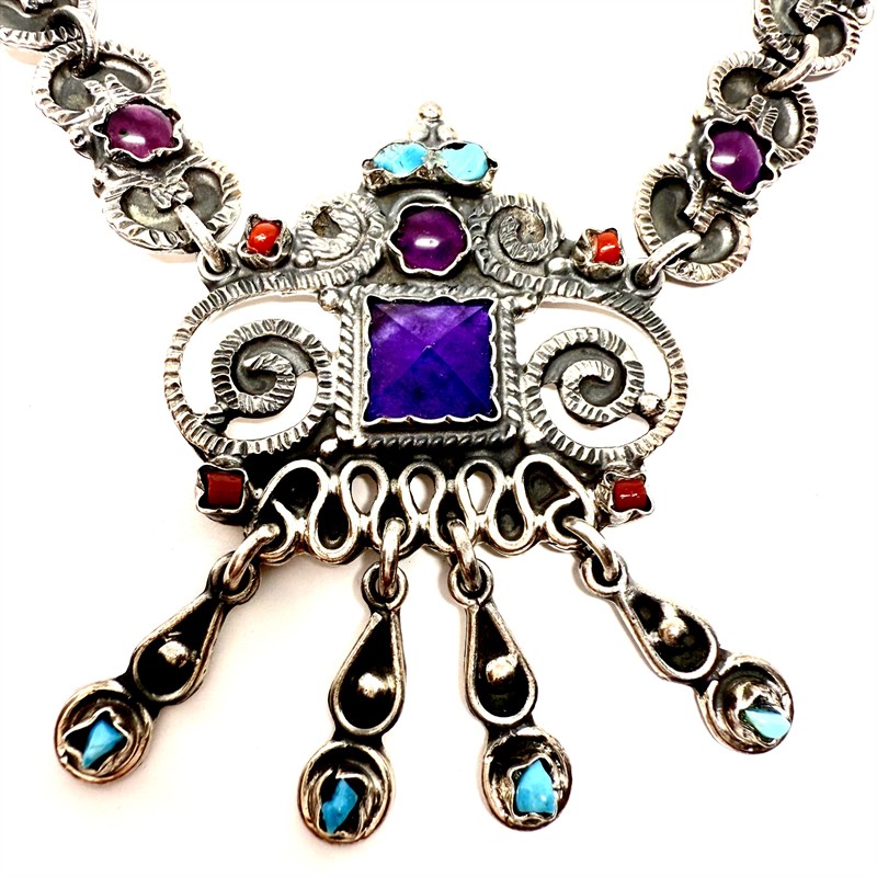 Originální, článkový náhrdelník z masivního stříbra. Šperk byl zhotoven v Mexiku ze sterlingového stříbra (925/1000), o celkové váze 79,88 g. Šperk je osazen drahými kameny - jedná se o ametysty, tyrkysy a korály. Délka 48 cm. Šperk v perfektním stavu.