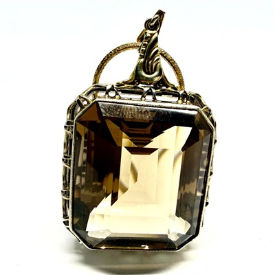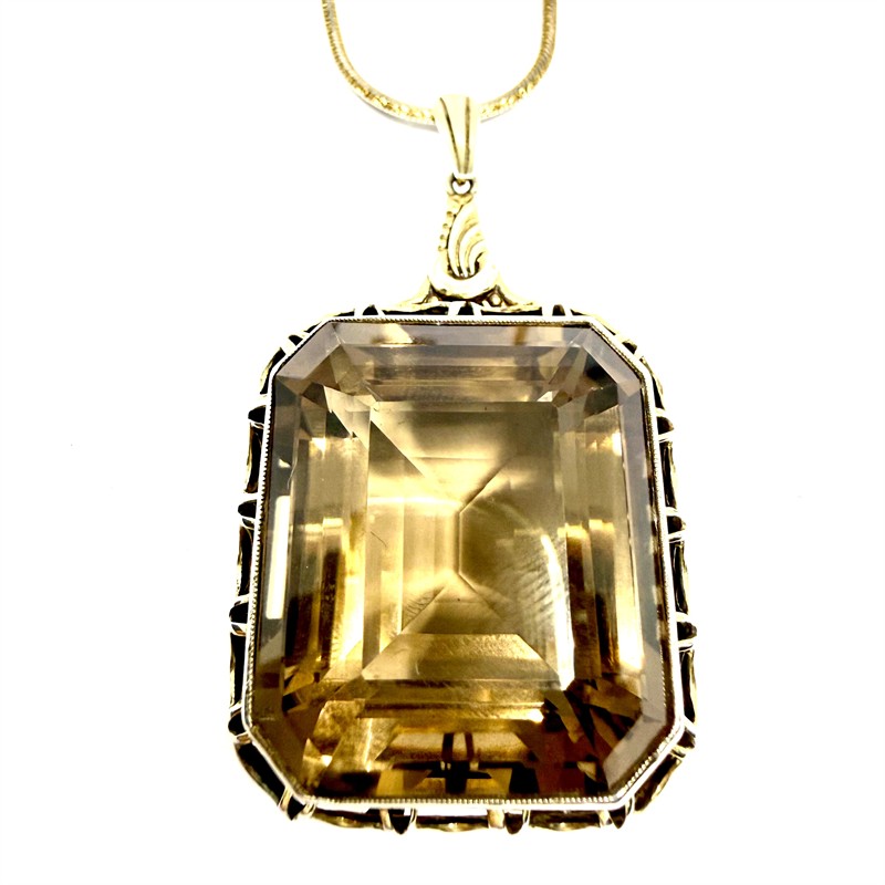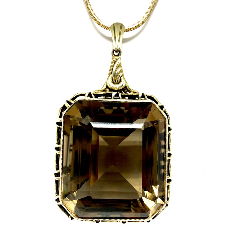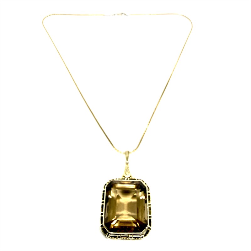 Nepřehlédnutelný náhrdelník ze zlaceného stříbra. Náhrdelník zdobí velký, odnímatelný závěs s grandiózním kouřovým topazem. Šperk byl zhotoven ze stříbra sterlingové ryzosti (925/1000). Celková váha 33,00 g. Délka řetízku 50 cm. Drahý kámen má sytou barvu a je přírodního původu. Výborný stav.