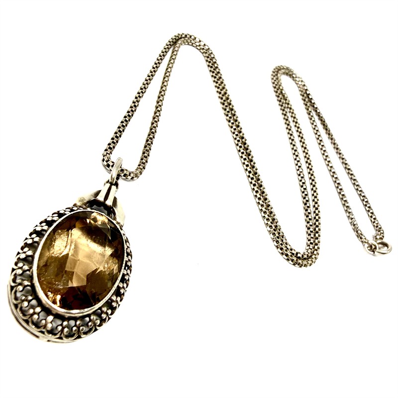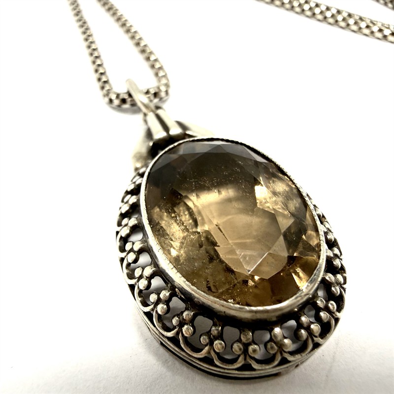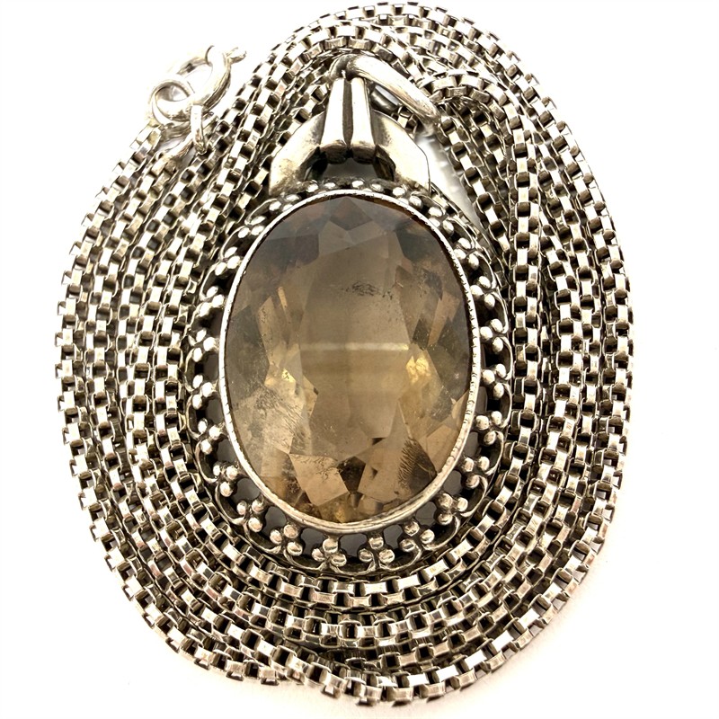 Půvabný, dlouhý, prvorepublikový náhrdelník. Nevšední řetízek zdobí odnímatelný závěs osazený velkým, fazetově broušeným, kouřovým topazem. Šperk byl zhotoven ze stříbra ryzosti 800/1000 v první polovině 20.století. Řetízek délky 61 cm ze sterlingového stříbra (925/1000). Celková váha šperku 10,15 g.
