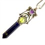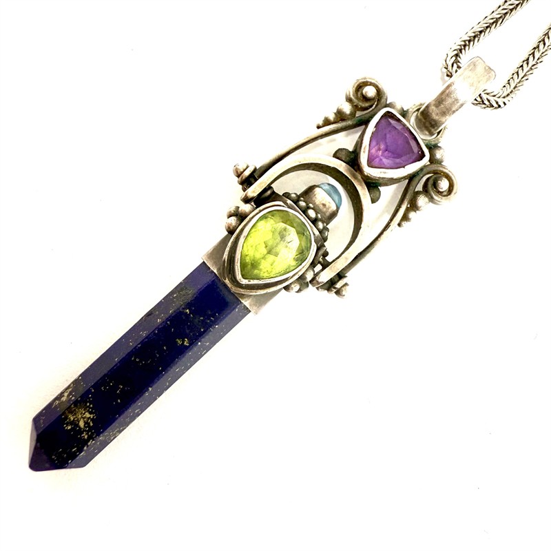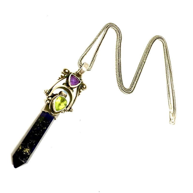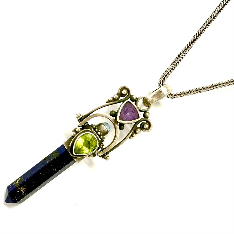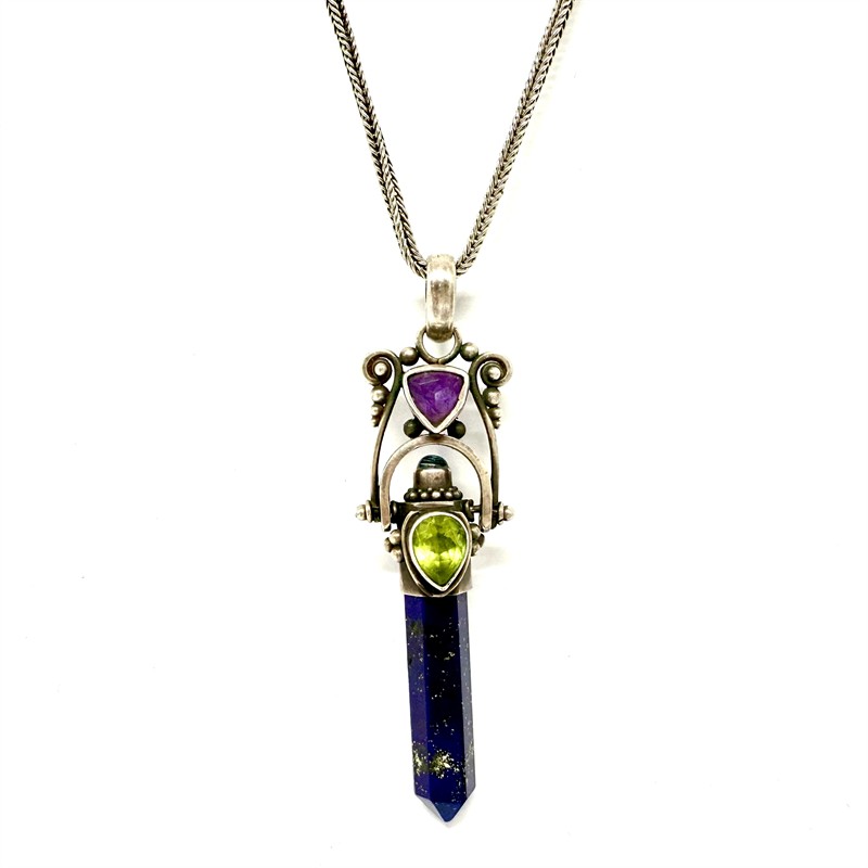 Půvabný, stříbrný náhrdelník zdobí větší, odnímatelný závěs. Šperku dominuju krystal lápisu lazuli. Dále šperk zdobí olivín a ametyst. Šperk byl vyroben ze stříbra ryzosti 925/21000, o celkové váze 19,86 g. Délka řetízku 50 cm, délka závěsu 6,5 cm. Perfektní stav.
