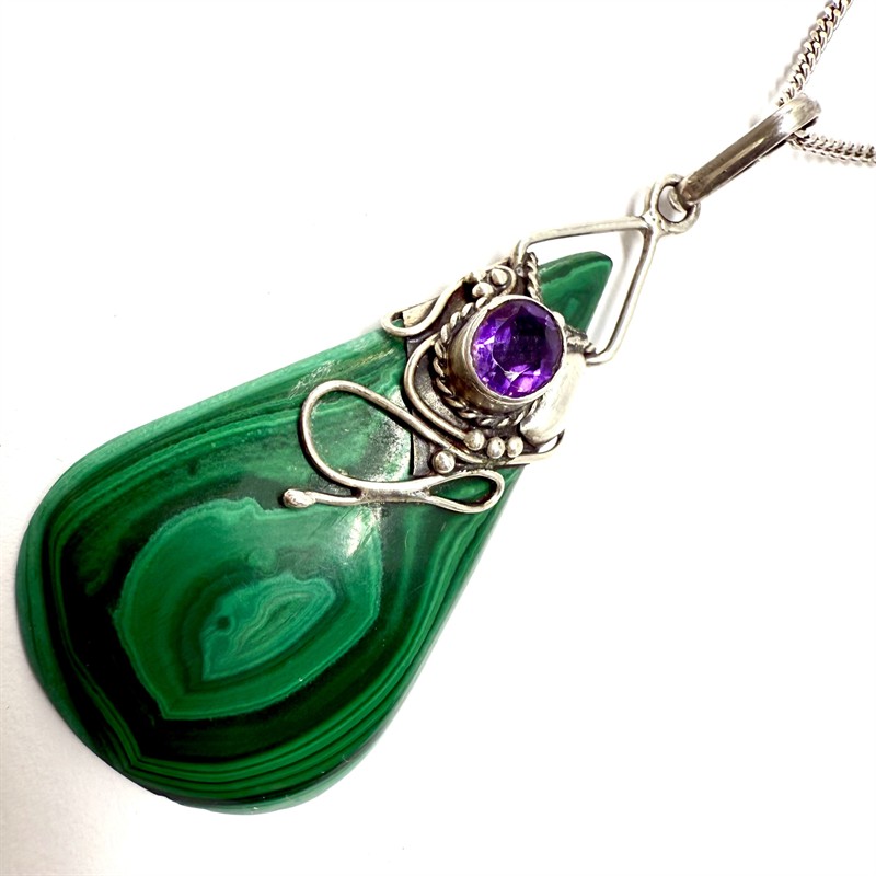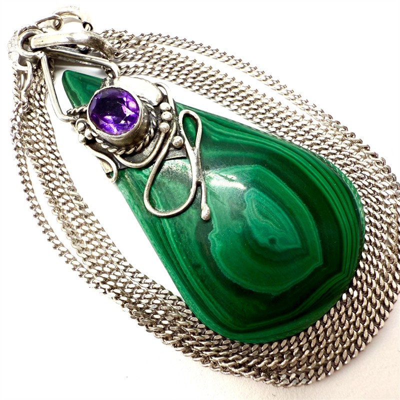 Půvabný stříbrný náhrdelník - řetízek s odnímatelným závěsem. Šperku dominuje sytě zelený malachit s krásnou, výraznou kresbou. Kámen je dekorován stříbrnou aplikací osázenou sytě fialovým ametystem. Stříbro ryzosti 925/1000. Celková váha 11,18 g. Délka řetízku 50 cm, rozměry závěsu cca 5,5 x 2 cm. Výborný stav.