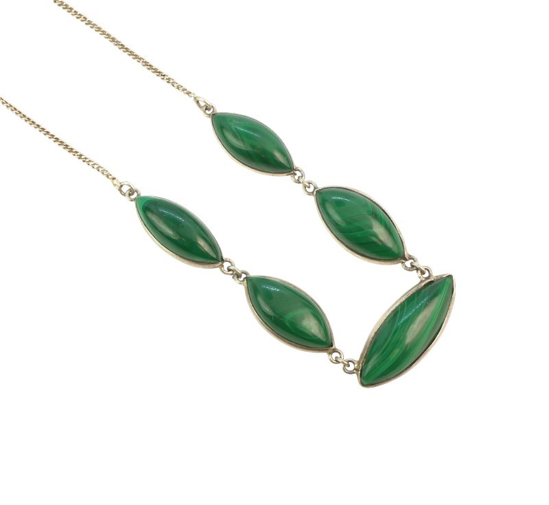 Moderní náhrdelník s malachity ze stříbra ryzosti 925/1000. Délka náhrdelníku je 48,5 cm. Celková hmotnost 22,78 g.