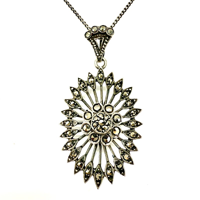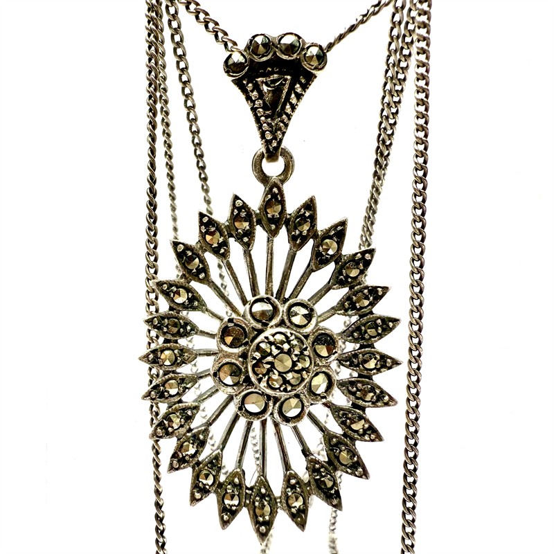 Půvabný, stříbrný náhrdelník s odnímatelným závěsem ve tvaru květu. Šperk zdobí velké množství elegantně se třpytících, pečlivě zafasovaných markazitů. Náhrdelník vyroben ze stříbra ryzosti 835/1000, o váze 8,86 g. Délka řetízku 51 cm. Rozměry závěsu cca 4,5 x 2 cm. Původní starý šperk ve výborném stavu.