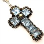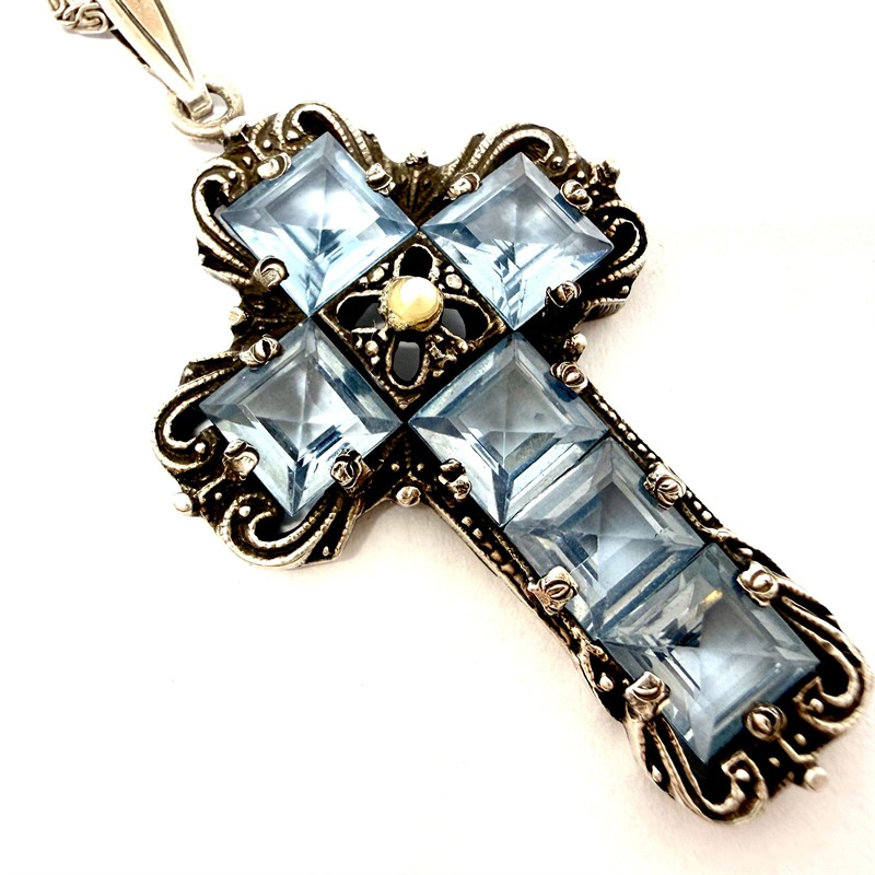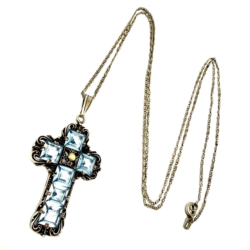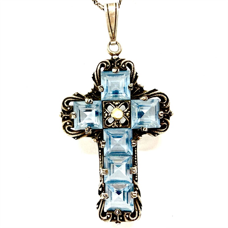 Půvabný, dlouhý náhrdelník zdobený odnímatelným závěsem. Šperk byl zhotoven ze stříbra ryzosti 800/1000 v první polovině 20.století. Zdobí jej blankytně modré spinely netradičně vybroušené do tvaru čtverce, na středu drobná, bílá perla. Řetízek volutového vzoru je dlouhý 59 cm. Celková váha šperku 8,53 g. Rozměry kříže 4,5 x 2,2 cm. Perfektní stav.
