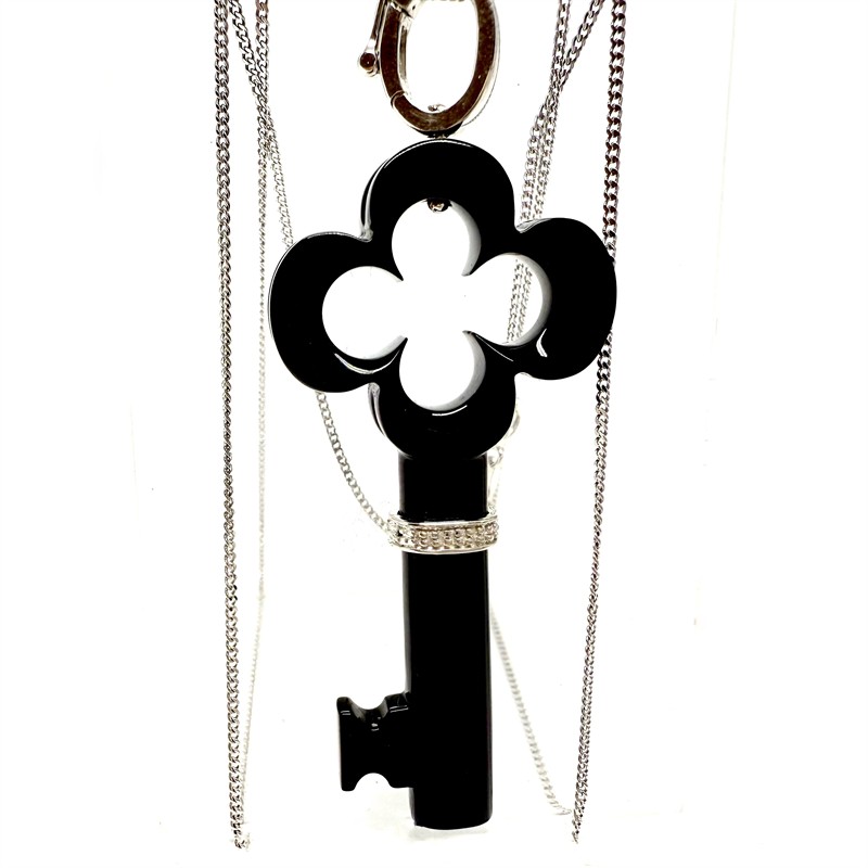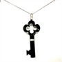 Půvabný stříbrný náhrdelník - jemný řetízek, který zdobí větší odnímatelný závěs ve tvaru klíče. Šperk byl zhotoven z obsidiánu a zdobí jej komponenty ze sterlingového stříbra (925/1000). Celková váha 7,24 g. Rozměry závěsu cca 6 x 2 cm. Délka řetízku 49 cm. Díky rozevíratelnému, závěsnému očku může být závěs nošen i na tlustém řetízku, korálcích, či perlách. Perfektní stav.