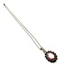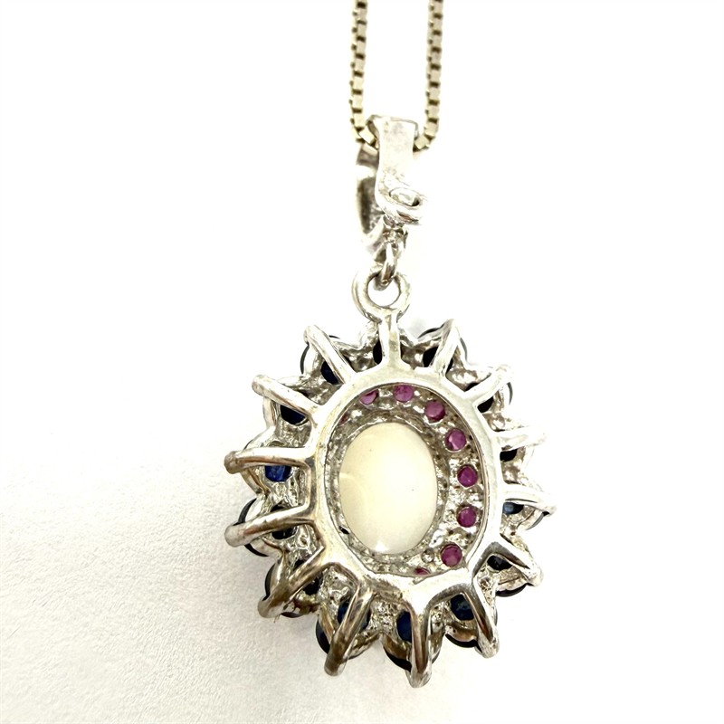 Půvabný stříbrný náhrdelník - řetízek typu kostka s odnímatelným závěsem bohatě zdobeným drahými kameny. Šperk byl vyroben ze stříbra sterlingové ryzosti (925/1000), o celkové váze 6,18 g. Závěs je osazen oválným opálem, které rámuje mezikruží drobných rubínu. Kontrastně dozdobeno tmavě modrými safíry. Drahé kameny jsou přírodního původu. Šperk disponuje velkým, rozevíratelným očkem, díky němuž lze zavěsit i na náhrdelník z drahých kamenů. Délka řetízku 45 cm. Výborný stav.
