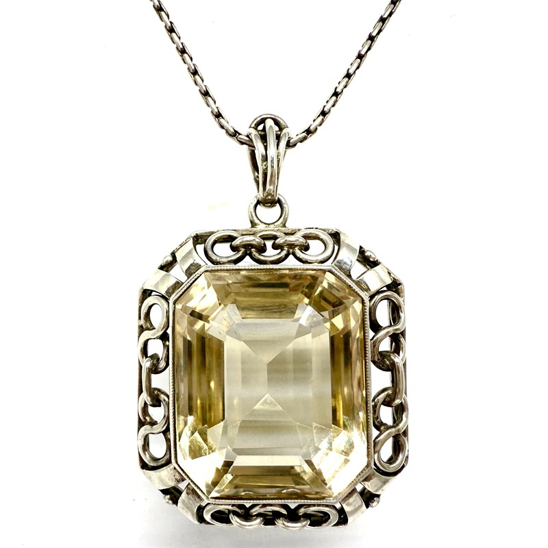Půvabný náhrdelník zdobený výrazným odnímatelným závěsem. Šperk byl vyroben ze stříbra ryzosti 835/1000 v první polovině 20.století. Rozměry závěsu bez závěsného očka 3 x 2,7 cm. Závěs je osazen velkým citrínem střední barevné sytosti. Řetízek o délce 59 cm je stejné ryzosti. Celková váha 18,54 g.Perfektní stav.