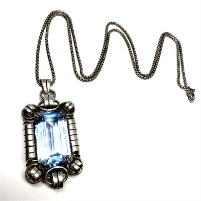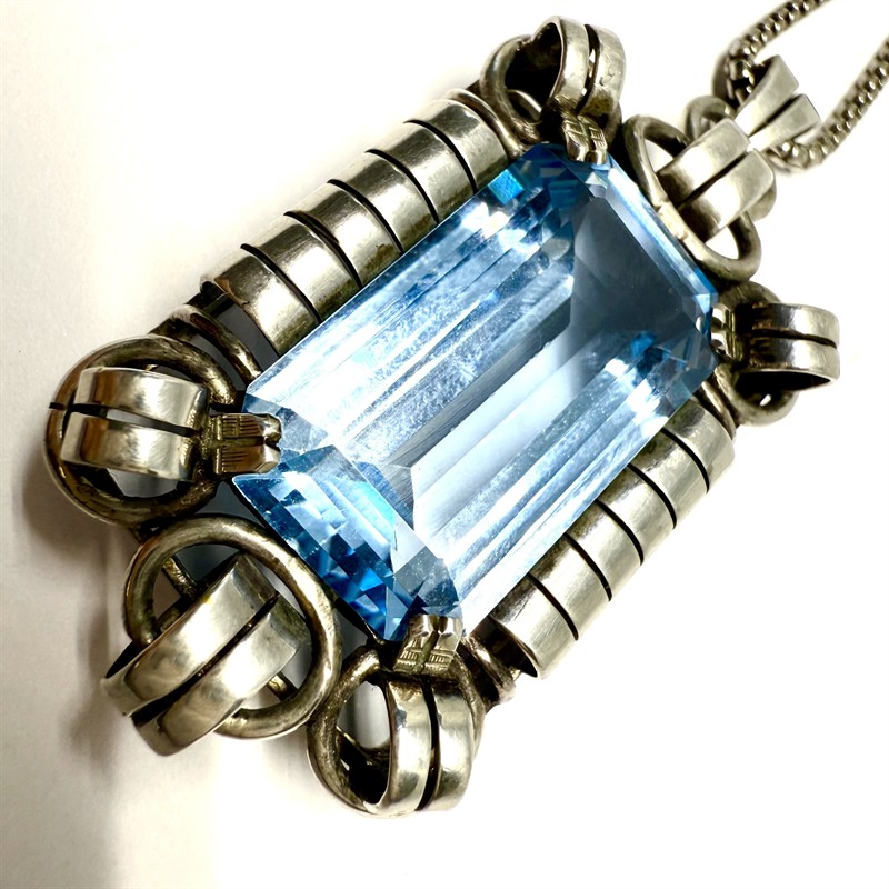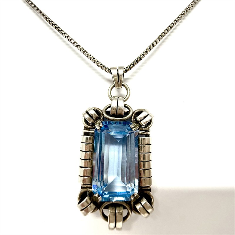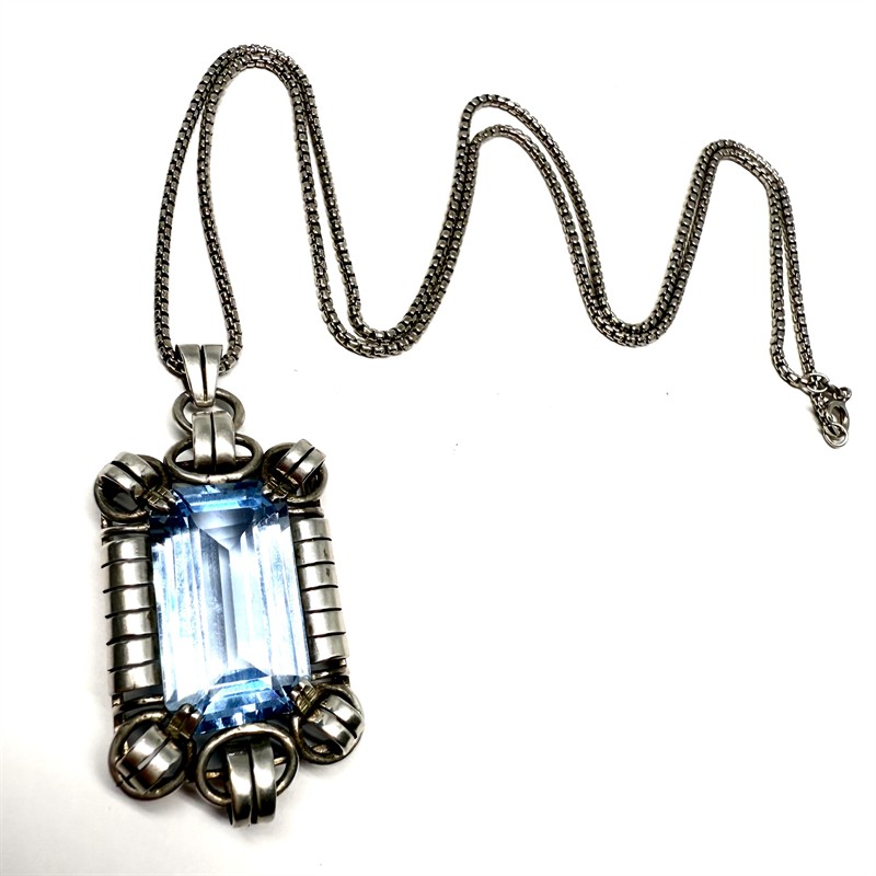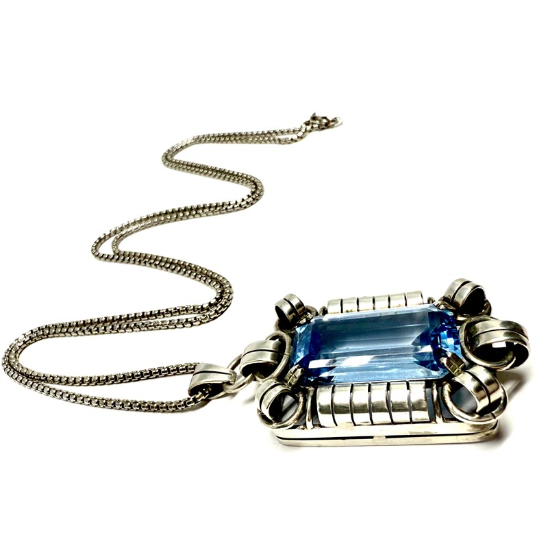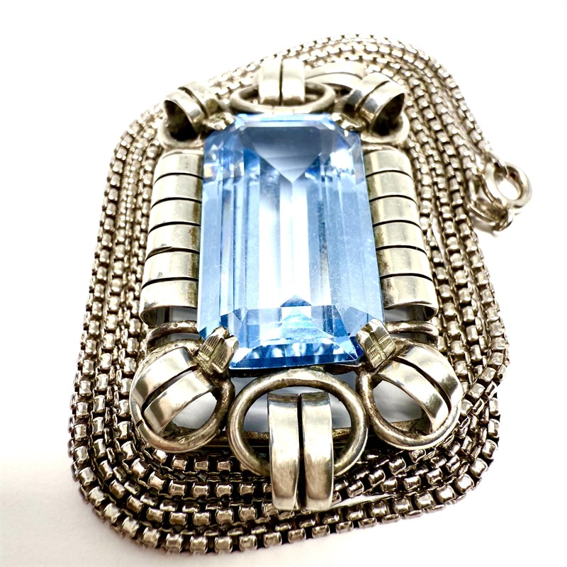 Výrazný, stříbrný náhrdelník - delší řetízek s odnímatelným, prvorepublikovým přívěsem. Designový šperk je osazen velkým, blankytně modrým spinelem. Šperk byl zhotoven ze stříbra ryzosti 750/1000. Řetízek dlouhý 65 cm je ze sterlingového stříbra (925/1000). Celková váha šperku 27,73 g. Rozměry závěsu 5 x 2,3 cm. Výborný stav.