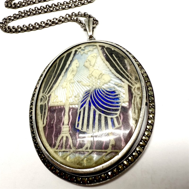 Nevšední stříbrný náhrdelník - delší řetízek s velkým, odnímatelným závěsem. Ten zdobí vyřezávaný plastický, rokokový motiv ženy krmící papouška. Orámováno elegantně se třpytícími markazity. Závěs byl zhotoven ze sterlingové stříbra (925/1000), řetízek o délce 67 cm ze stříbra ryzosti 835/1000. Celková váha 31,20 g. Závěs je většího rozměru cca 4 x 6 cm. Velmi dobrý stav.