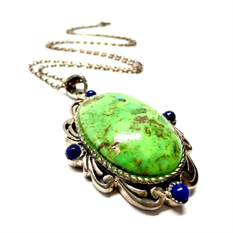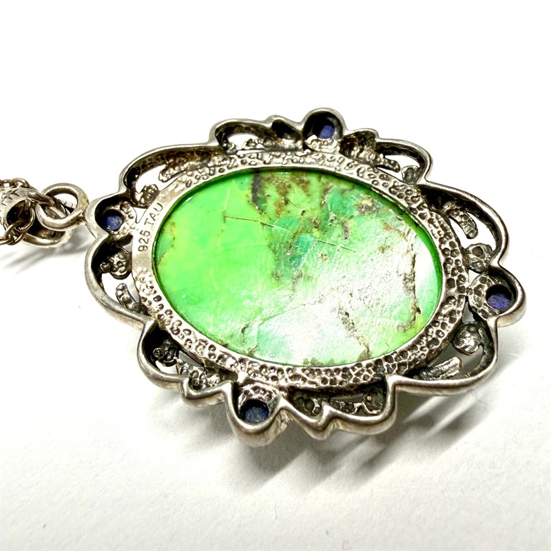 Nepřehlédnutelný, velmi půvabný náhrdelník. Řetízek s odnímatelným, větším závěsem. Ten byl zhotoven ze stříbra sterlingové ryzosti (925/1000). Závěsu dominuje sytě zelený kámen se zlatavými inkluzemi. Ten byl zasazen do zdobného rámu, jenž je osazen čtyřmi kuličkami lápisu lazuli. Řetízek délky 45 cm vyroben ze stříbra ryzosti 800/1000. Celková váha 11,48 g. Perfektní stav.