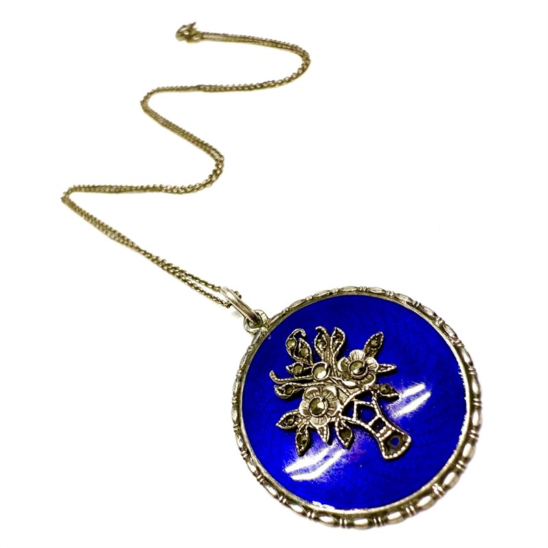 Půvabný, stříbrný náhrdelník s odnímatelným závěsem. Šperk zdobí malebný, plasticky ztvárněný košíček osazený markazity a sytě modrý smalt v odstínu královská modř. Náhrdelník byl vyroben ze stříbra ryzosti 800/1000 a má průměr 2,5 cm. Řetízek o délce 43 cm má ryzost 835/1000. Celková váha 6,48 g.