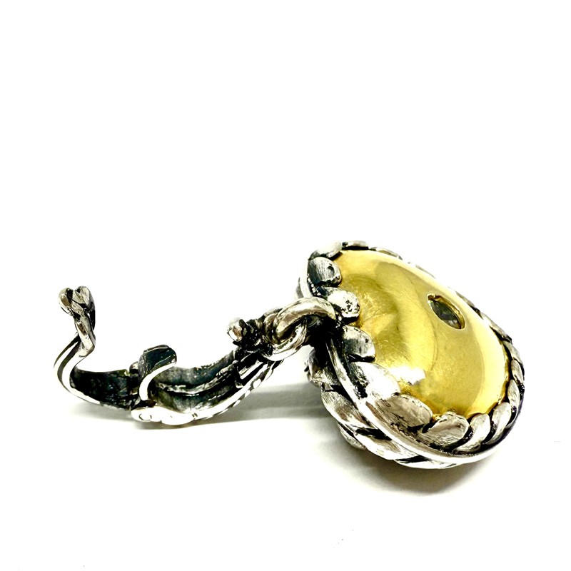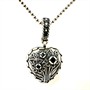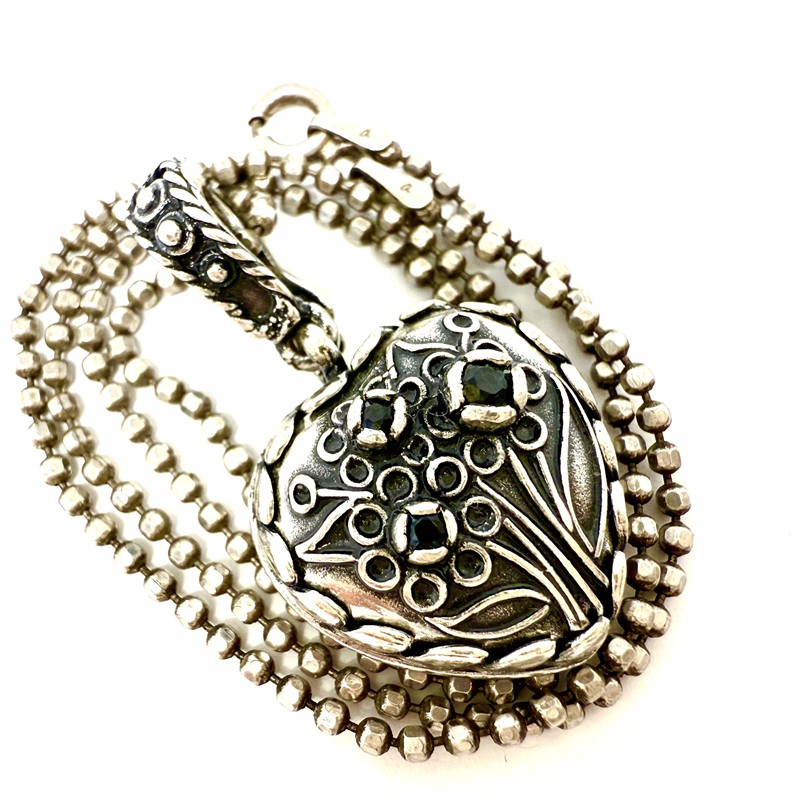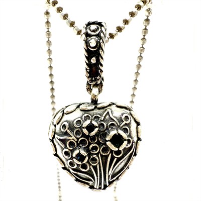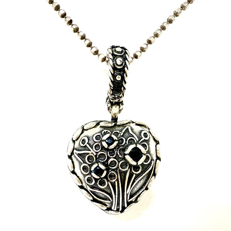 Půvabný stříbrný náhrdelník - řetízek zdobený odnímatelným závěsem ve tvaru srdce. Závěs je zdoben z přední strany plastickým, florálním motivem. Středy květin jsou osazeny tmavě modrými safíry. Střed zadní části zdobí zlacení a bílý kámen briliantového brusu, díky velkému, rozevíratelnému očku skýtá závěs možnost použití i na tlusté náhrdelníky. Sterlingové stříbro (925/1000), celková váha 12,89 g. Délka řetízku 41,5 cm. Perfektní stav.