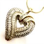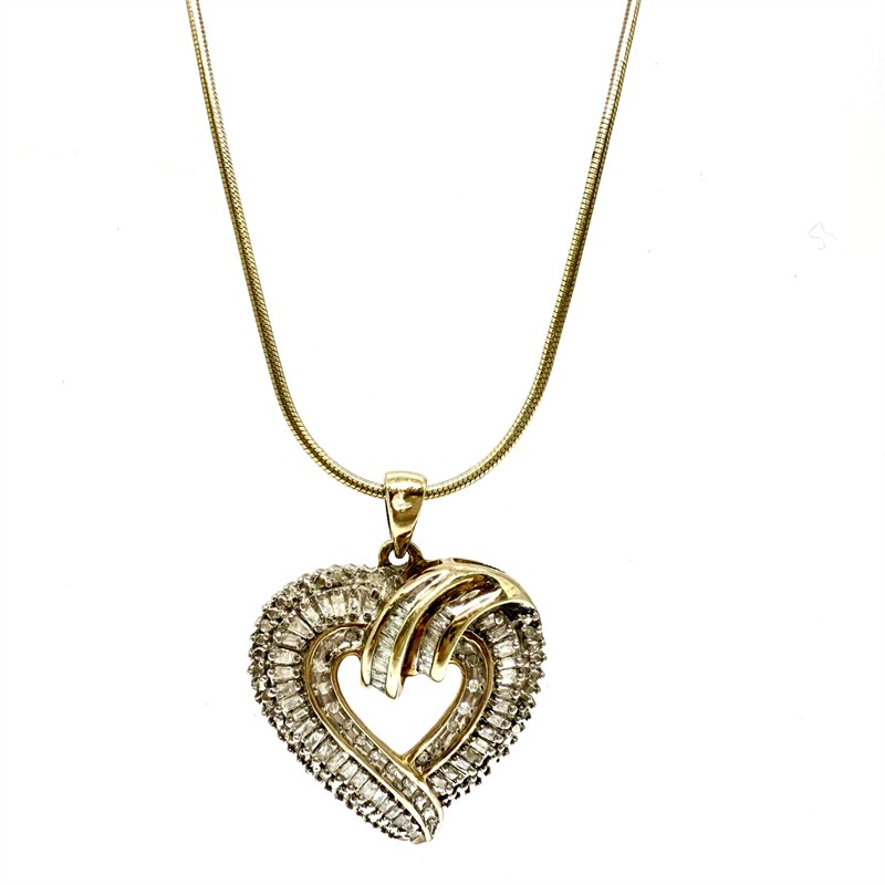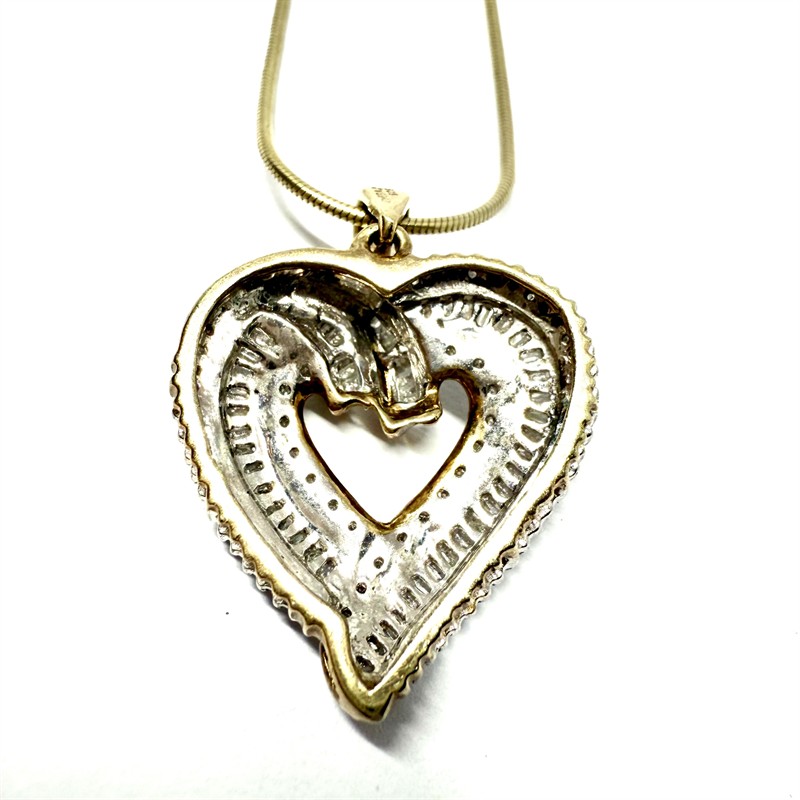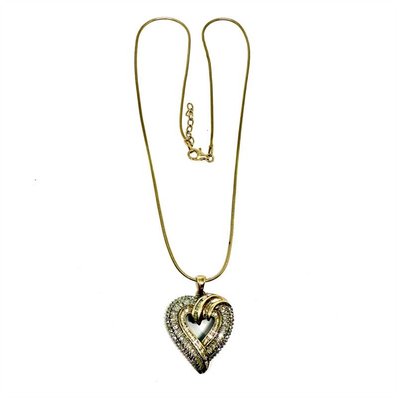 Půvabný, elegantní náhrdelník - hladký řetízek s odnímatelným závěsem ve tvaru srdce. Šperk byl zhotoven ze zlaceného sterlingového stříbra (925/1000), o celkové váze 8,96 g. Srdce je bohatě osázeno diamanty. Tyto drahokamy jsou přírodního původu. Délka řetízku 43 cm + 2,5 cm. Rozměry závěsu cca 3 x 2 cm. Perfektní stav.