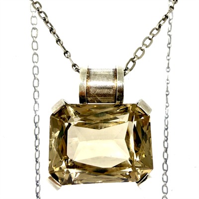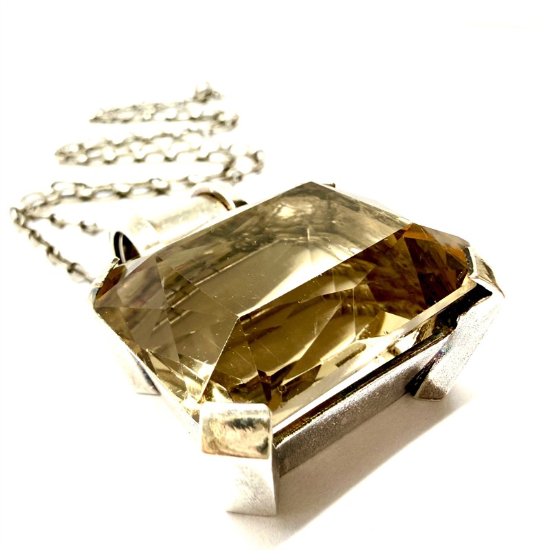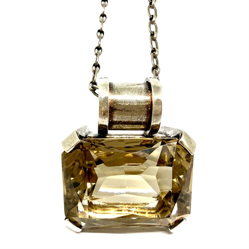 Designový, stříbrný náhrdelník s masivním, odnímatelným závěsem. Šperk je tvořen delším řetízkem s většími oky zdobenými intenzivním šrafováním. Dominantu šperku představuje výrazný závěs osazený velký kouřovým topazem. Stříbro sterlingové ryzosti 925/1000, řetízek stříbro ryzosti 835/1000. Celková váha 50,06 g. Délka řetízku je 60 cm, rozměry závěsu 3,6 x 3,2 cm. Značeno autorskou, ryzostí a puncovní značkou. Perfektní stav.