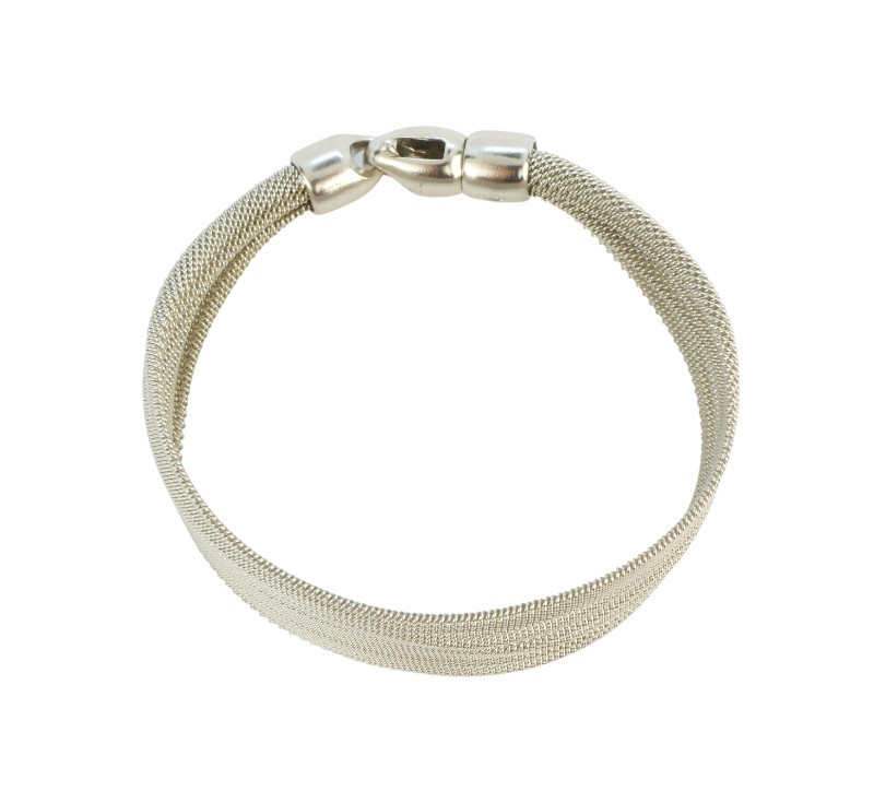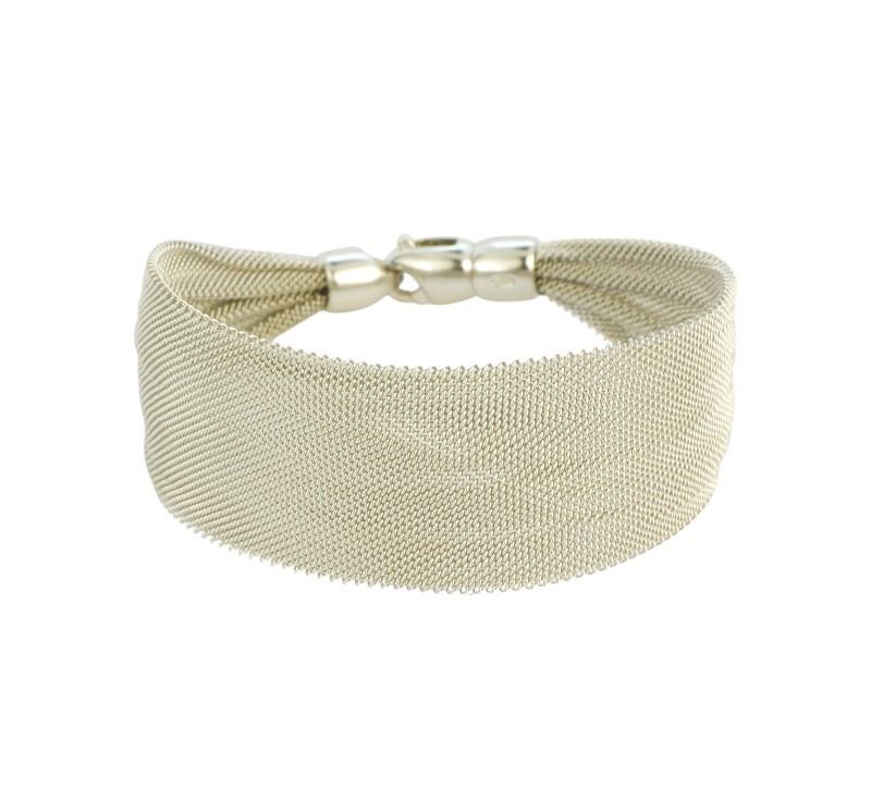 Jednoduchý, elegantní náramek ze stříbra ryzosti 925/1000 působící jako pásek tkaniny. Celková hmotnost náramku je 19,37 g. Délka 17 cm (na štíhlou ruku).