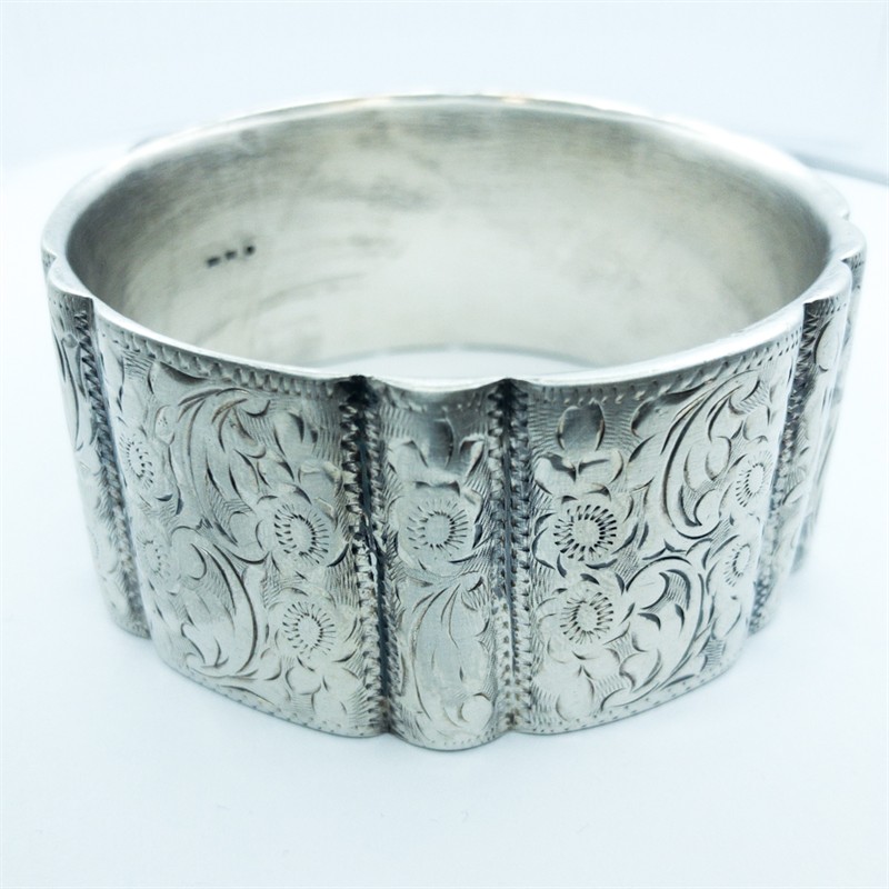 Starožitný masivní stříbrný kulatý náramek, Čechy, 20. - 30. léta 20. století, období Art Deco, stříbro o ryzosti 900/1000 o celkové hmotnosti 74,39 g, průměr náramku: 7 cm, šířka náramku: 3,5 cm