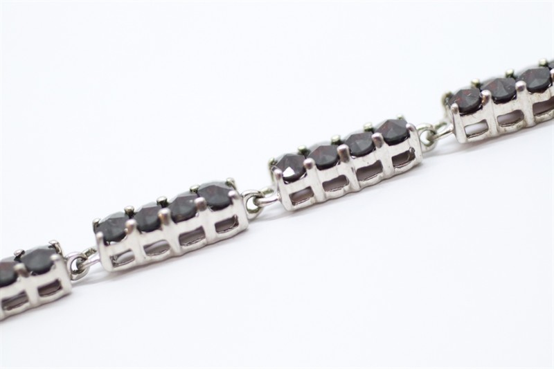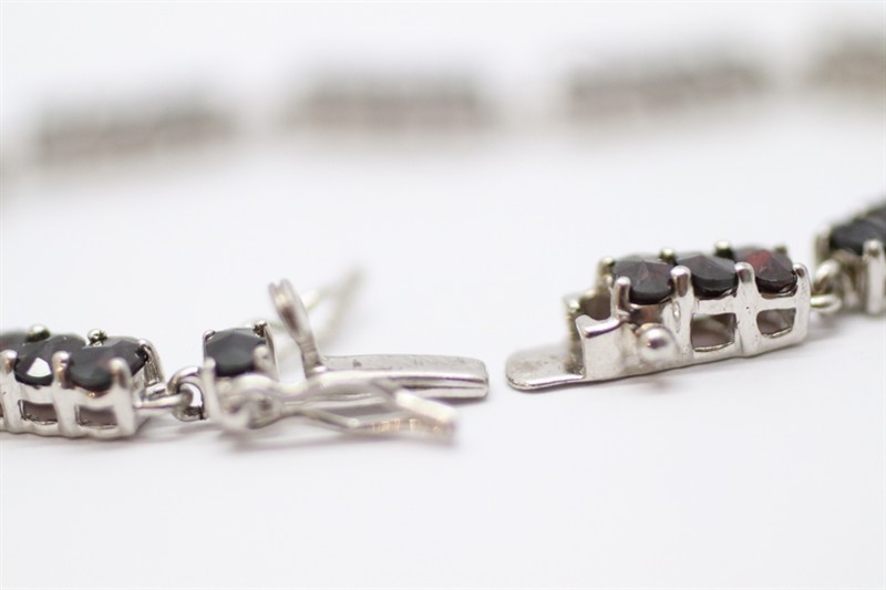 Stříbrný náramek s almandiny. Stříbro Ag 925/1000. Váha: 11,02 g. Délka: 17 cm.