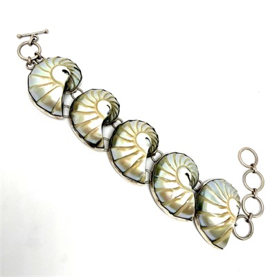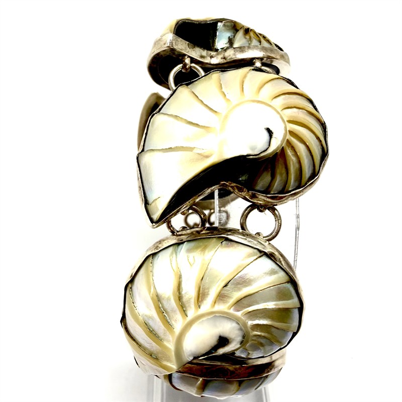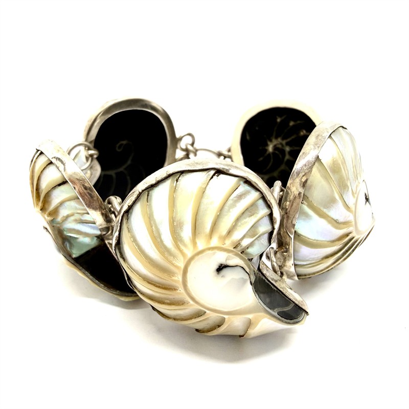 Nevšední, výrazný, stříbrný náramek s pěti amonity. Šperk byl vyroben ze sterlingového stříbra 925/1000, o celkové váze 54,74 g. Amonit je nevšední, přírodní fosilie pocházející z Madagaskaru. Její stáří se datuje přibližně před 66 - 425 miliony let. Díky svému stáří jsou symbolem času, vývoje a nekonečného koloběhu života. Délka 16 cm plus prodlužovací očka 5 cm. Výborný stav.