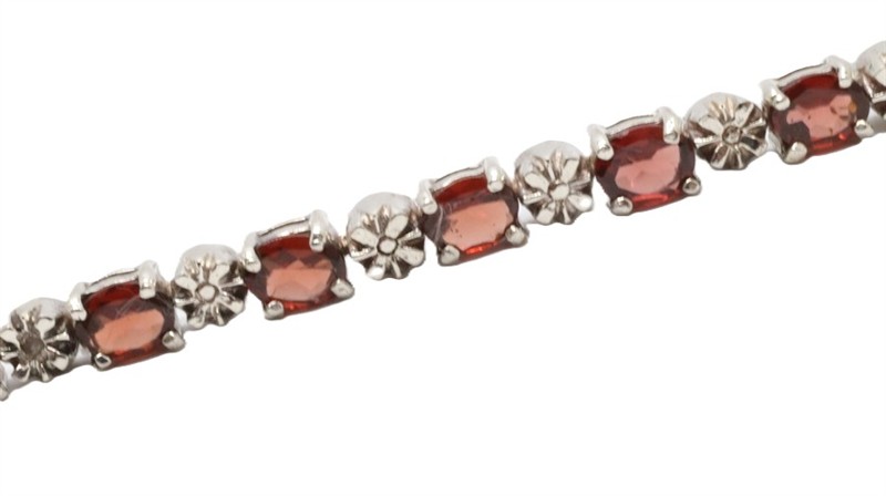 Stříbrný náramek s granáty. Stříbro 925/1000. Přírodní granáty (almandiny), celková váha 5,88 ct. Váha náramku: 13,82 g. Délka náramku: 19,5 cm.