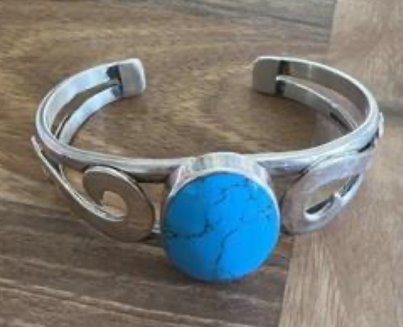 stříbrný náramek s tyrkysem ,o ryzosti Ag 925/1000. Jedná se o šperk z poslední čtvrtiny 20. století. Celková hmotnost 42 g, šířka tyrkysu 3 cm ,Značeno - 925, Šperk je vyrazný A dobře nositelný , Profesionálně vyčištěno, výborný stav.