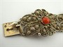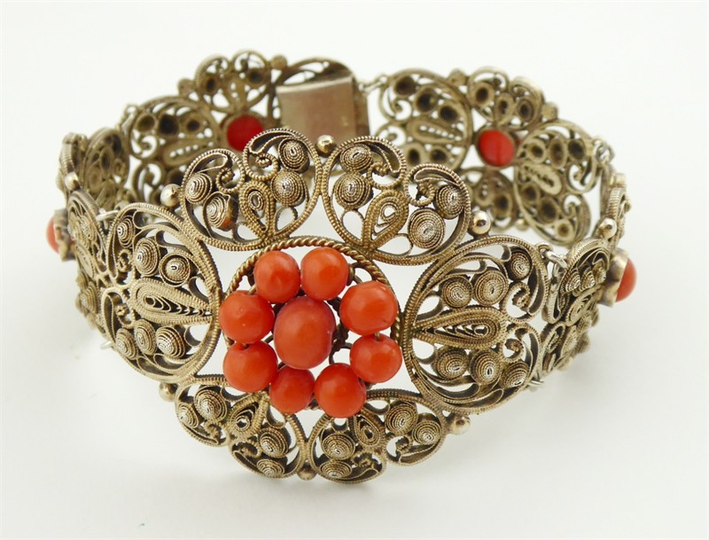 Stříbro, přírodní mořské korály. Ryzost Ag 875/1000, celková hmotnost 36,27 g. Stříbrný náramek s výjimečnou ukázkovou prací šperkařské techniky ornamentu filigránu zdobený pravými středomořskými korály. Značeno zespodu: estonské puncy, nově označeno platným českým puncem a ryzost 875. Estonsko 1922 - 1940. Délka 180 mm, šířka 38 mm.