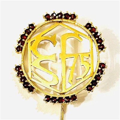 Velká, zřídka vídaná jehlice, jež slouží i jako odznak, kulatá hlavice s prořezávanou písmennou zkratkou "ČSF 75", rámeček přerušovaně osázen českými granáty kulatého hvězdicového brusu, fasováno zrnkovou technikou. Udíleno předním filmovým osobnostem a zasloužilým pracovníkům kinematografie k 75. výročí československého filmu v roce 1974, odznak prováděn i v podobě přívěšku. Originální design, precizní granátnická práce DUV Granát v Turnově z roku 1973. Sběratelsky zajímavé. Zhotoveno ze zlaceného stříbra o ryzosti 900/1000; punc S-67 (zajíc 3), ryzostní číslo se značkou výrobce "G7" na jehle. Hmotnost 4,40 g, celková délka 76 mm, šířka 29 mm. Ve velmi zachovalém stavu, odborně vyčištěno a vyleštěno zlatníkem.