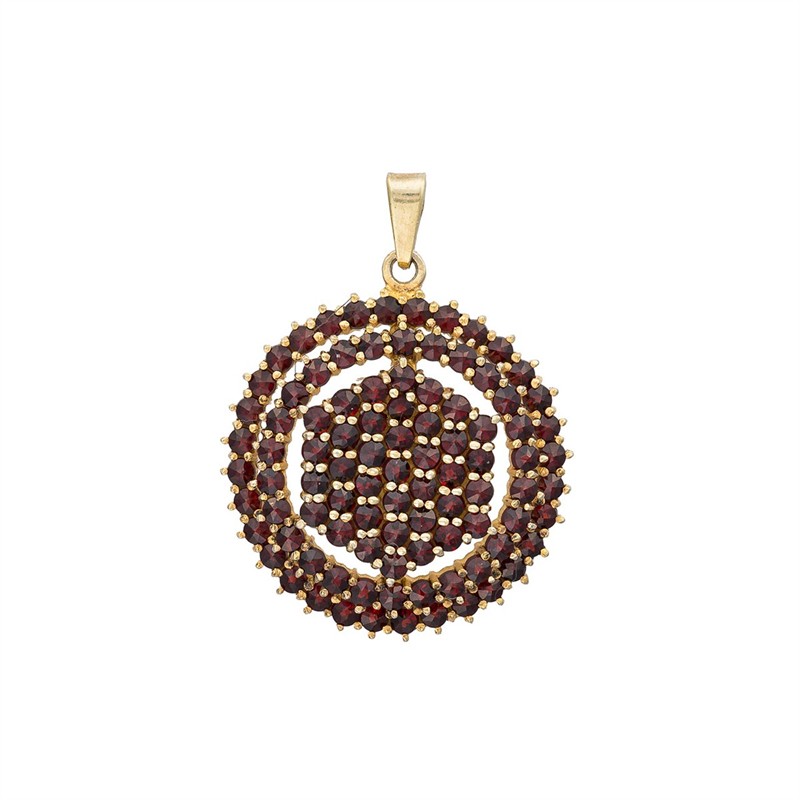 Materiál: stříbro o ryzosti 900 /1000 Hmotnost: 6,27 g Rozměry: výška s ouškem 3,2 cm, průměr 2,5 cm Drahokamy: – české granáty Stav: výborný Původ: zlatnická práce, opatřená platným puncem Puncovního úřadu České republiky