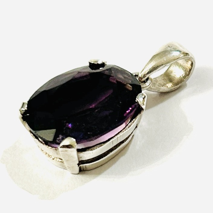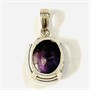 Elegantní, designem nadčasový přívěšek, jemuž dominuje přírodní sytější ametyst oválného brusu, pečlivě fasováno krapnami v hlavici s podélnou průsvitkou. Kvalitní západoevropská zlatnická práce z 20. století. Zhotoveno z nezlaceného stříbra o ryzosti 925/1000; neznačeno. Hmotnost 2,86 g, celková délka 24 mm, šířka 12 mm. V zachovalém stavu.