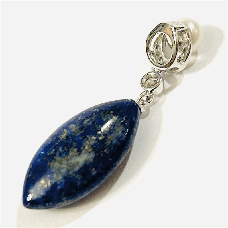 Nový, elegantní přívěšek, hlavice osazena přírodní kultivovanou bílou perlou, doplněno brilantními čirými kameny kulatého brusu, ověsek z přírodního lapis lazuli ve tvaru zašpičatělé elipsy. Západoevropská zlatnická práce z 10. let 20. století. Zhotoveno z nezlaceného stříbra o ryzosti 925/1000; ryzostní číslo na očku. Hmotnost 4,44 g, délka 43 mm, šířka 12 mm. Nikdy nenošeno, stav nový, tedy intaktní.