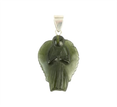 Nevšední, větší přívěšek, jehož tělo je tvořeno ruční glyptikou přírodního vltavínu do postavy anděla strážného, tradičním ochranitelským symbolem. Oboustranně detailně ryto, decentní masivnější očko pro zavěšení. Tuzemská kvalitní řezačská práce z první pětiny 21. století. Ouško zhotoveno z nezlaceného stříbra o ryzosti 925/1000; ryzostní číslo zezadu. Hmotnost 6,71 g, celková délka 46 mm, šířka 25 mm. Ve velmi zachovalém stavu.