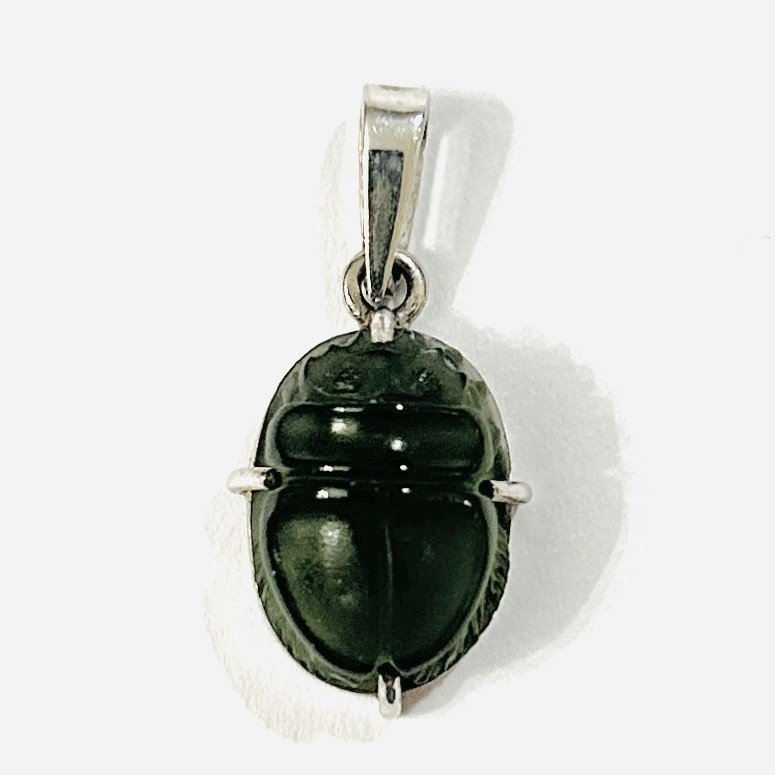 Nevšední přívěšek, jehož tělo je tvořeno ruční glyptikou přírodního vltavínu ve tvaru scarabea, fasováno krapnami v decentním rámečku. Tradiční egyptský symbol spojovaný se znovuzrozením a ochranou. Tuzemská kvalitní řezačská práce z první pětiny 21. století. Zhotoveno z nezlaceného stříbra o ryzosti 925/1000; ryzostní číslo na očku. Hmotnost 1,93 g, celková délka 25 mm, šířka 12 mm. Ponecháno s přirozenou patinou, lze vyčistit, celkově ve velmi zachovalém stavu.