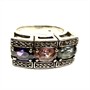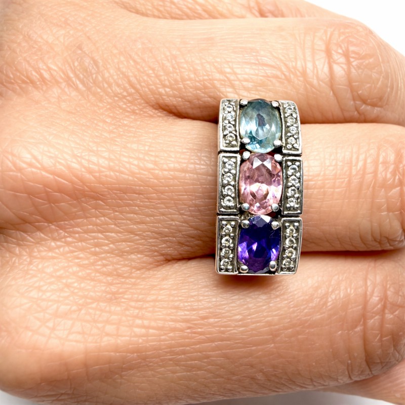 Elegantní, stříbrný prsten zdobený fazetově broušenými, transparentními kameny v červánkových odstínech. Šperk byl vyroben ze stříbra sterlingové ryzosti 925/1000. Celková váha 7,65 g. Velikost 52. Výborný stav.