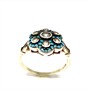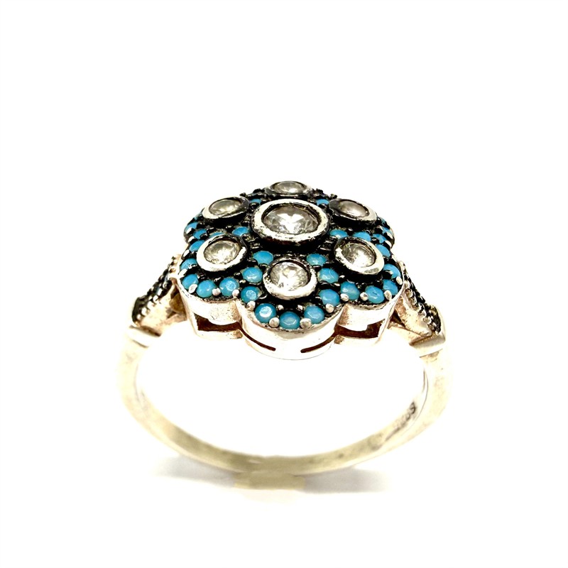 Nevšední, jemný prsten. Šperk byl zhotoven ze stříbra sterlingové ryzosti 925/1000, o celkové váze 3,28 g. Drahé kameny jsou seskupeny do tvaru květu. Kameny jsou pečlivě fasovány. Velikost 61. Výborný stav.
