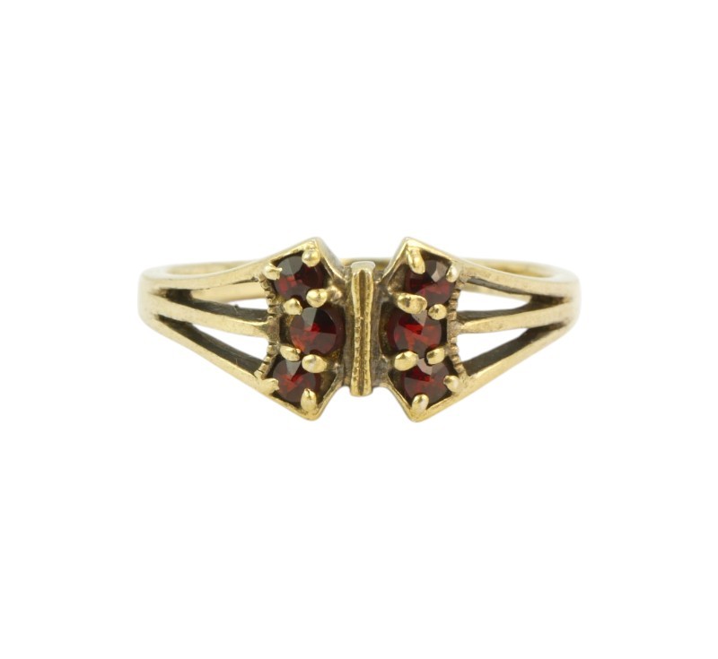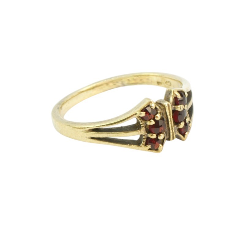 Prsten vyrobený ze stříbra ryzosti 900/1000 (punc zajíc) zdobený českými granáty. Velikost 56. Hmotnost 2,28 g.