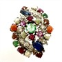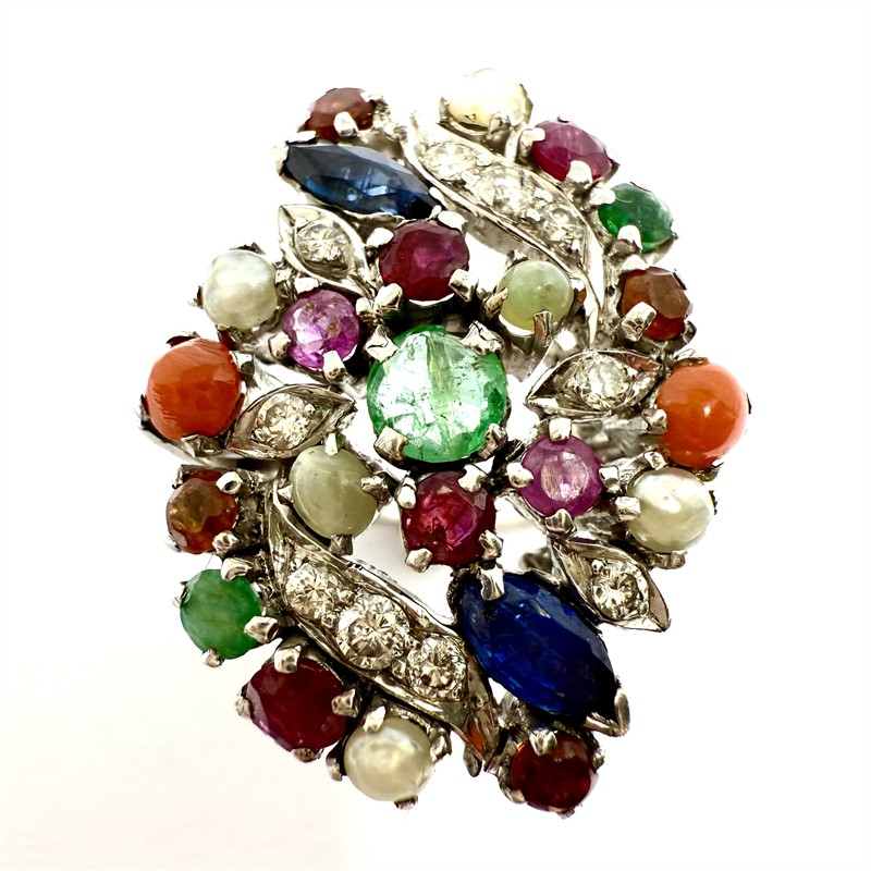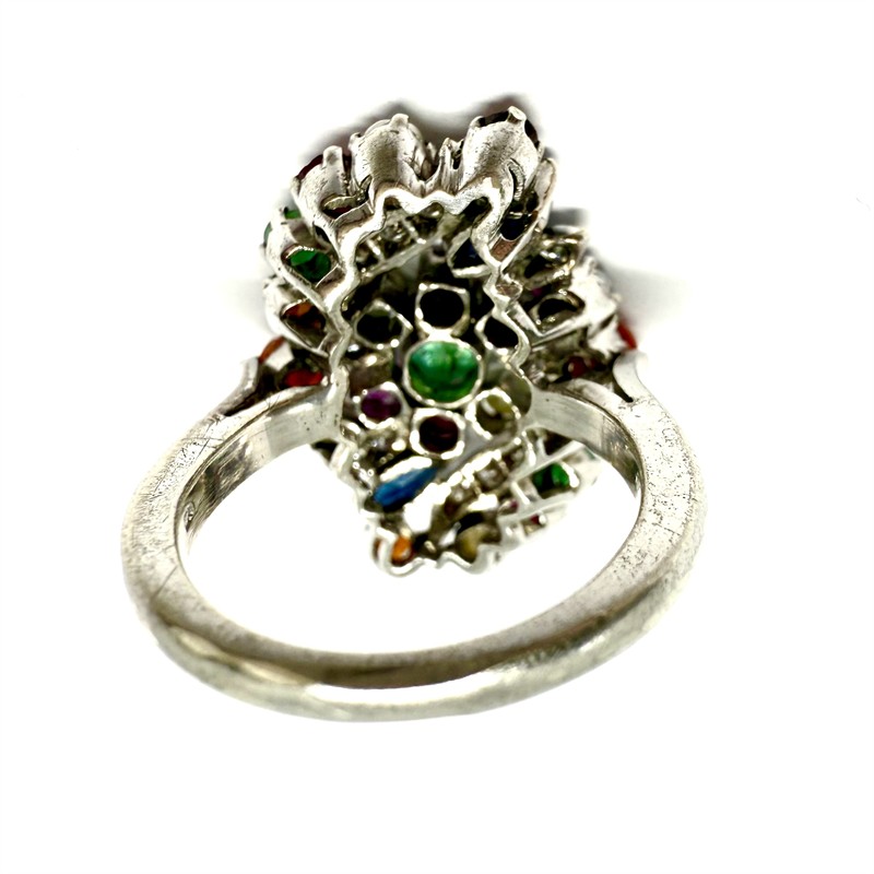 Originální prsten zhotovený ze sterlingového stříbra (925/1000). Jedná se o ateliérový šperk zdobený brilianty, safíry, smaragdy, rubíny a korály. Drahokamy jsou přírodního původu. Celková váha 6,80 g. Velikost 52. Rozměry velké, zdobné hlavy cca 2,5 x 2 cm. Perfektní stav.