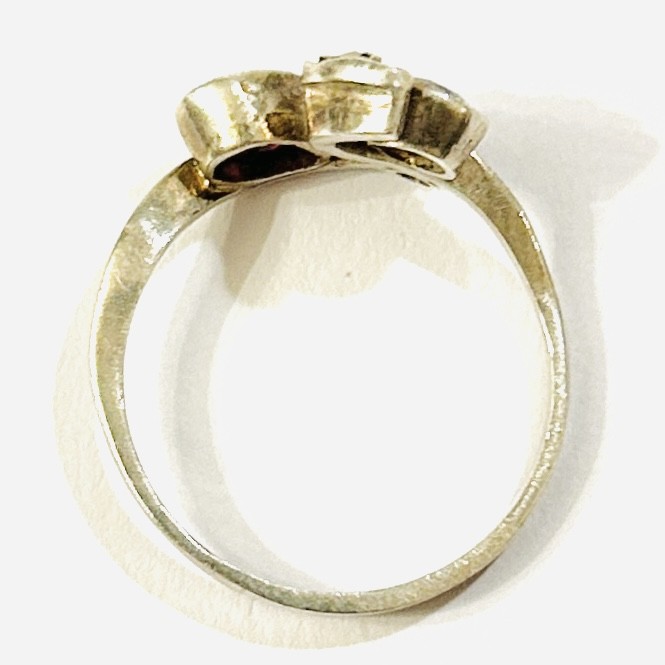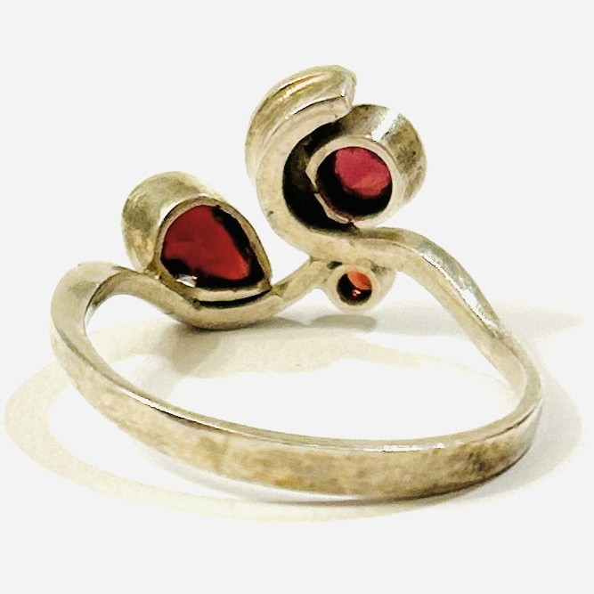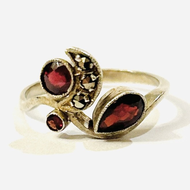 Půvabný prsten s asymetrickou hlavicí inspirovanou florálními křivkami, v zrnitých obrubách osazeno přírodními granáty a almandinem kulatého a kapkového brusu, v lístku doplněno přírodními markazity kulatého hvězdicového brusu. Západoevropská zlatnická práce z poslední třetiny 20. století. Zhotoveno z nezlaceného stříbra o ryzosti 835/1000; punc S-68 (zajíc 4) zevnitř šíny. Hmotnost 2,34 g, velikost 57, šířka hlavice 11,5 mm. Ponecháno s přirozenou patinou, lze vyčistit, celkově v zachovalém stavu.