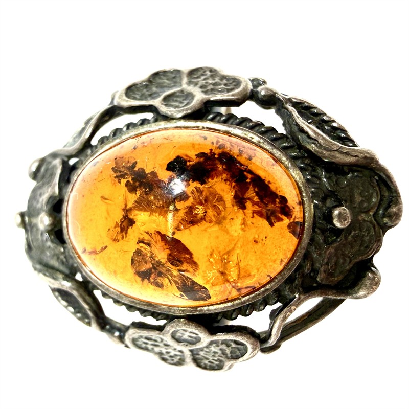 Půvabný, originální stříbrný prsten. Šperk byl zhotoven v secesním duchu ze sterlingového stříbra (925/1000), o celkové váze 5,63 g. Střed šperku je osazen jantarem s bohatou inkluzí. Velikost 60. Šperk byl ponechán s původní půvabnou patinou a je v perfektním stavu.
