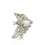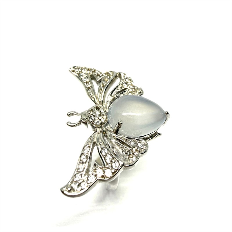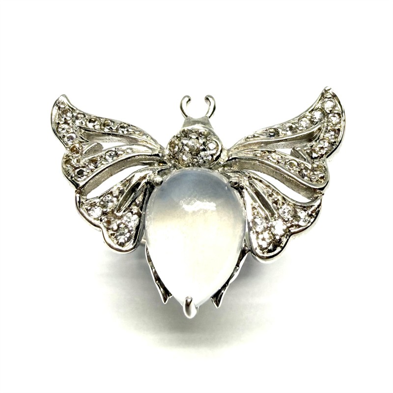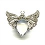 Výrazný, originální stříbrný prsten - motýl. Šperk byl zhotoven ze sterlingového stříbra (925/1000), o celkové váze 5,95 g. Šperku vévodí měsíční kámen hladkého brusu, křídla jsou osazena drobnými transparentními kameny diamantového brusu i brilance. Velikost 53. Perfektní stav.