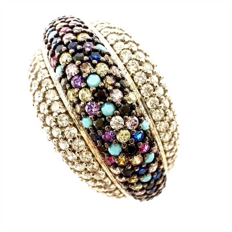Elegantní, nápaditý stříbrný prsten. Šperk byl vyroben ze sterlingového stříbra (925/1000), o celkové váze 5,64 g. Šperk zdobí velké množství drobných, pečlivě fasovaných kubických zirkonií v multikolorním provedení. Velikost 55. Perfektní stav.