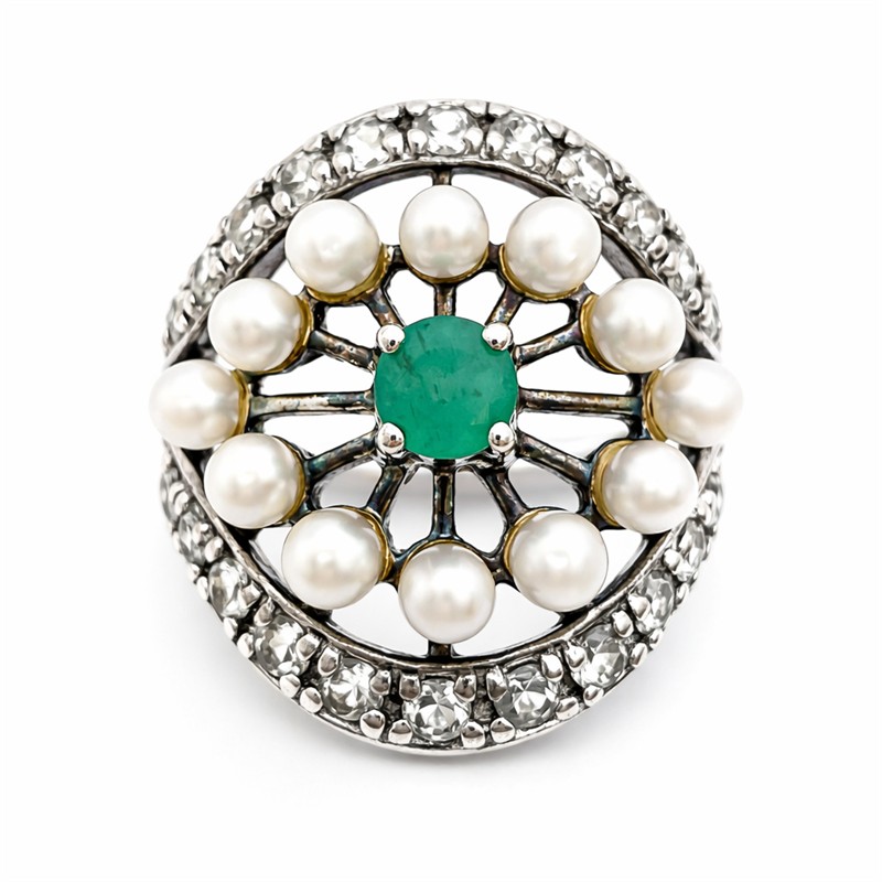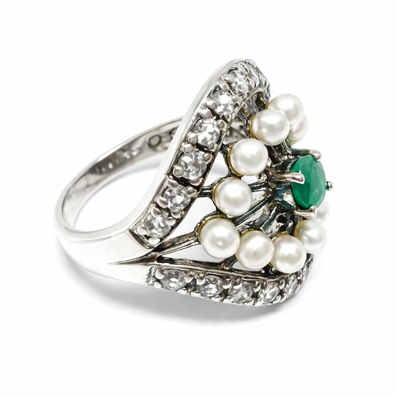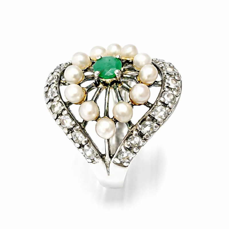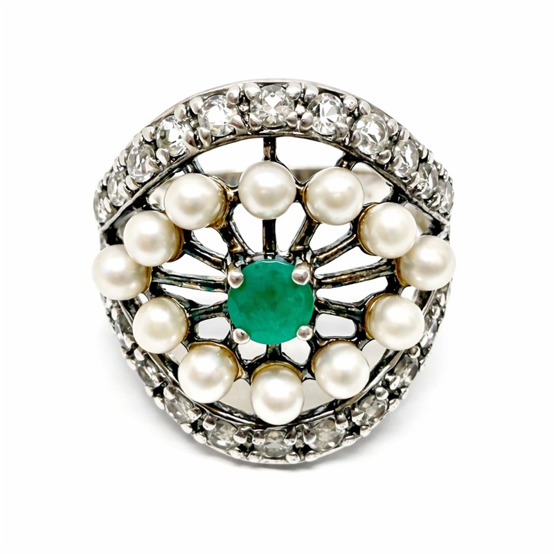 č. 182 747 Stříbrný prsten se smaragdem a perlami
