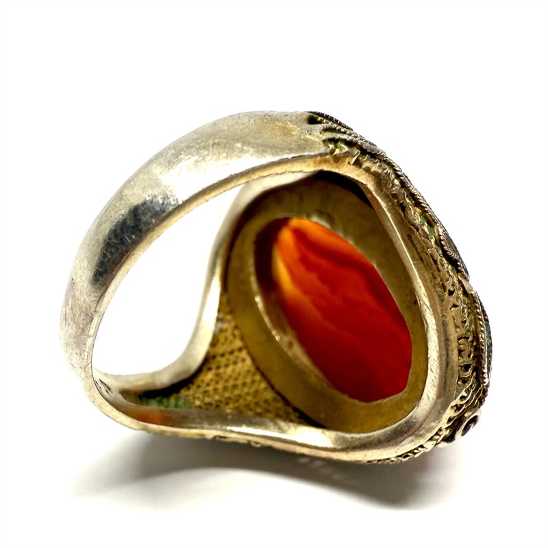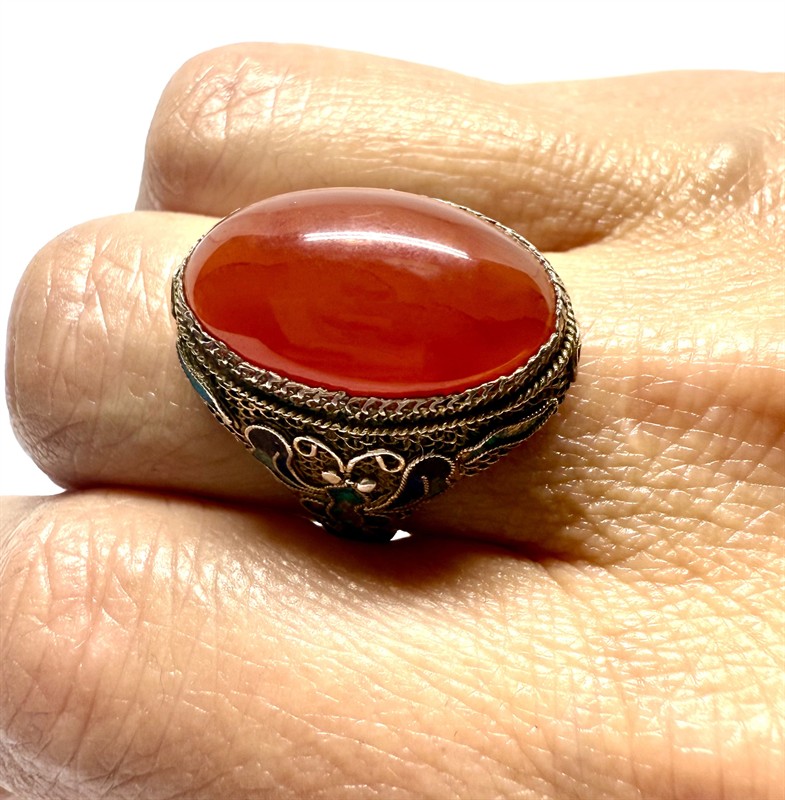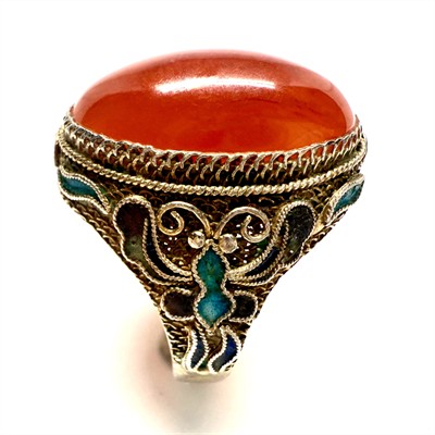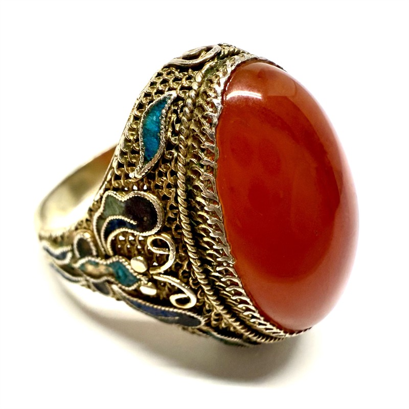 Stříbrný prsten zdobený smalty a hnědým achátem