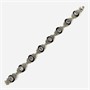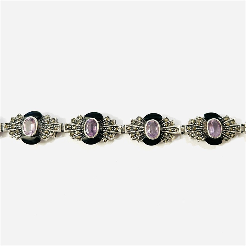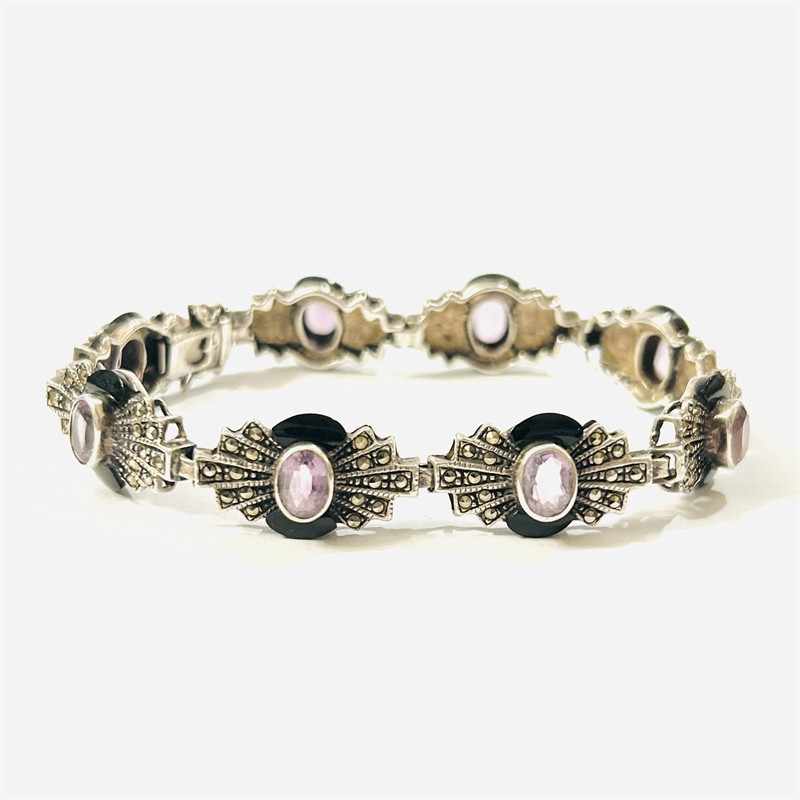 Elegantní, slavnostně působící náramek v pseudoart-deco stylu, články ve tvaru mašle osazeny ve středové hladké obrubě přírodními ametysty oválného brusu, dále přírodními černými onyxy atypického brusu a přírodními markazity kulatého hvězdicového brusu v zrnitých lůžkách. Kvalitní západoevropská práce z poslední pětiny 20. století. Zhotoveno z nezlaceného stříbra o ryzosti 925/1000; vyhotoveno osvědčení puncovního úřadu, ryzostní číslo a značení na zapínání. Hmotnost 21,70 g, délka 19,5 cm, šířka 13 mm. Ponecháno s přirozenou patinou, lze vyčistit, celkově ve velmi zachovalém stavu.