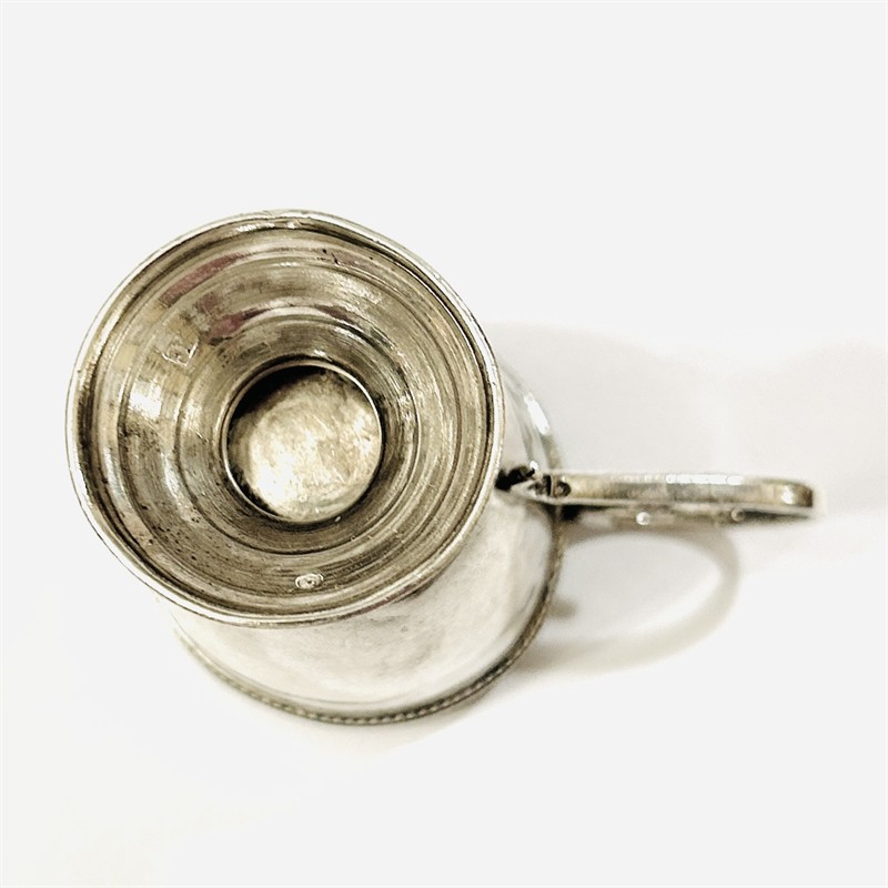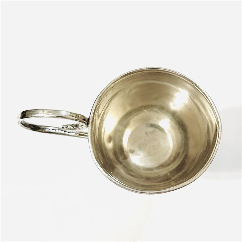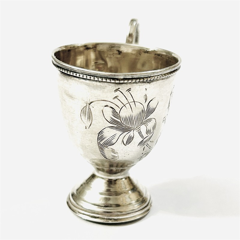 Dekorativní, secesní pohárek na noze s uchem, vejcovitá miska zdobena florálním gravírováním, opatřeno monogramem a jménem v azbuce. Určeno jako památeční křestní pohár, solidní ruská práce z počátku 20. století. Sběratelsky zajímavé. Zhotoveno z nezlaceného 84 zolotnikového stříbra, tj. o ryzosti 875/1000; vyhotoveno osvědčení puncovního úřadu, ruský punc "hlava ženy 84 v oválu" a mistrovská značka zvnějšku při okraji, doplňková značka "hlava ženy v kruhu" zevnitř nohy. Hmotnost 30,73 g, výška 60 mm, šířka bez ucha 41,5 mm, s uchem 67,5 mm. Ve velmi zachovalém stavu, odborně vyčištěno a vyleštěno zlatníkem.