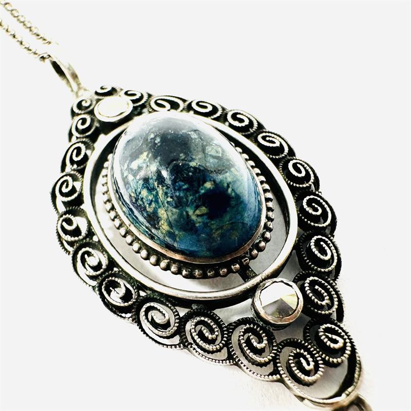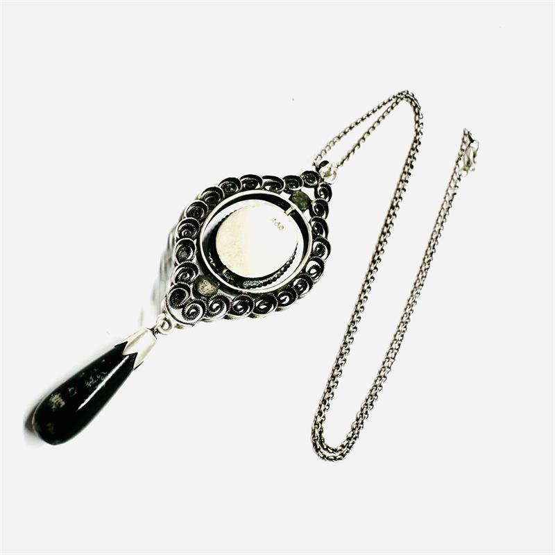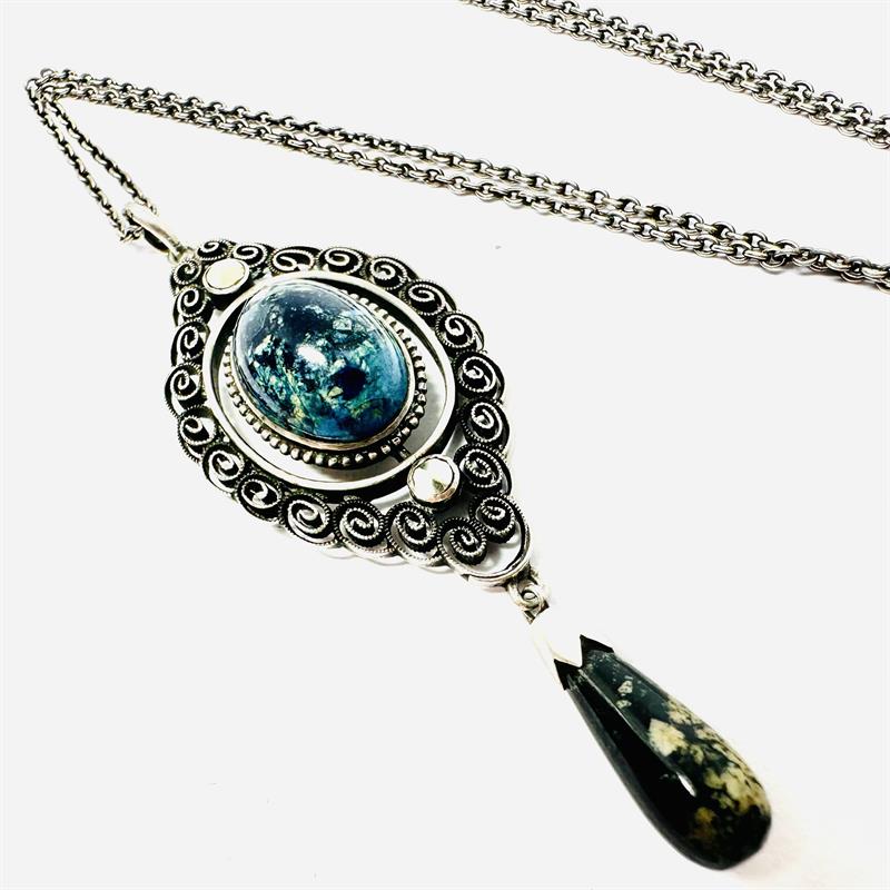 Mimořádně půvabný stříbrný náhrdelník vyrobený v secesním stylu v první polovině 20.století. Vyroben ze stříbra ryzosti 800/1000, o celkové váze 8,70 g. Délka řetízku 47 cm, délka odnímatelného závěsu 6,5 cm. Perfektní, sbírkový stav.